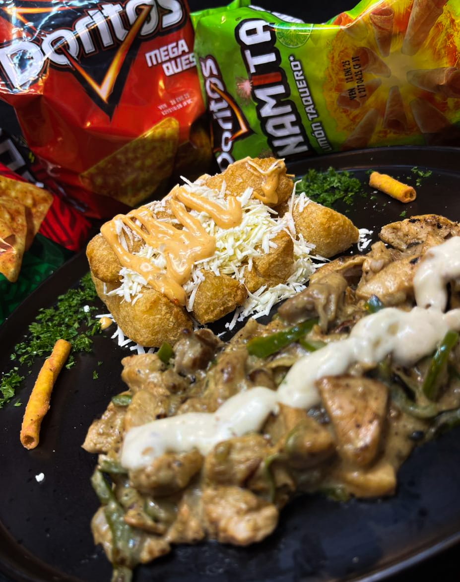 5 deliciosas croquetas de yuca frita, bañadas en nuestra salsa especial de chipotle picante, con acompañamiento de pollo grill, pimentón y cebolla, y decorado con Doritos dinamita.