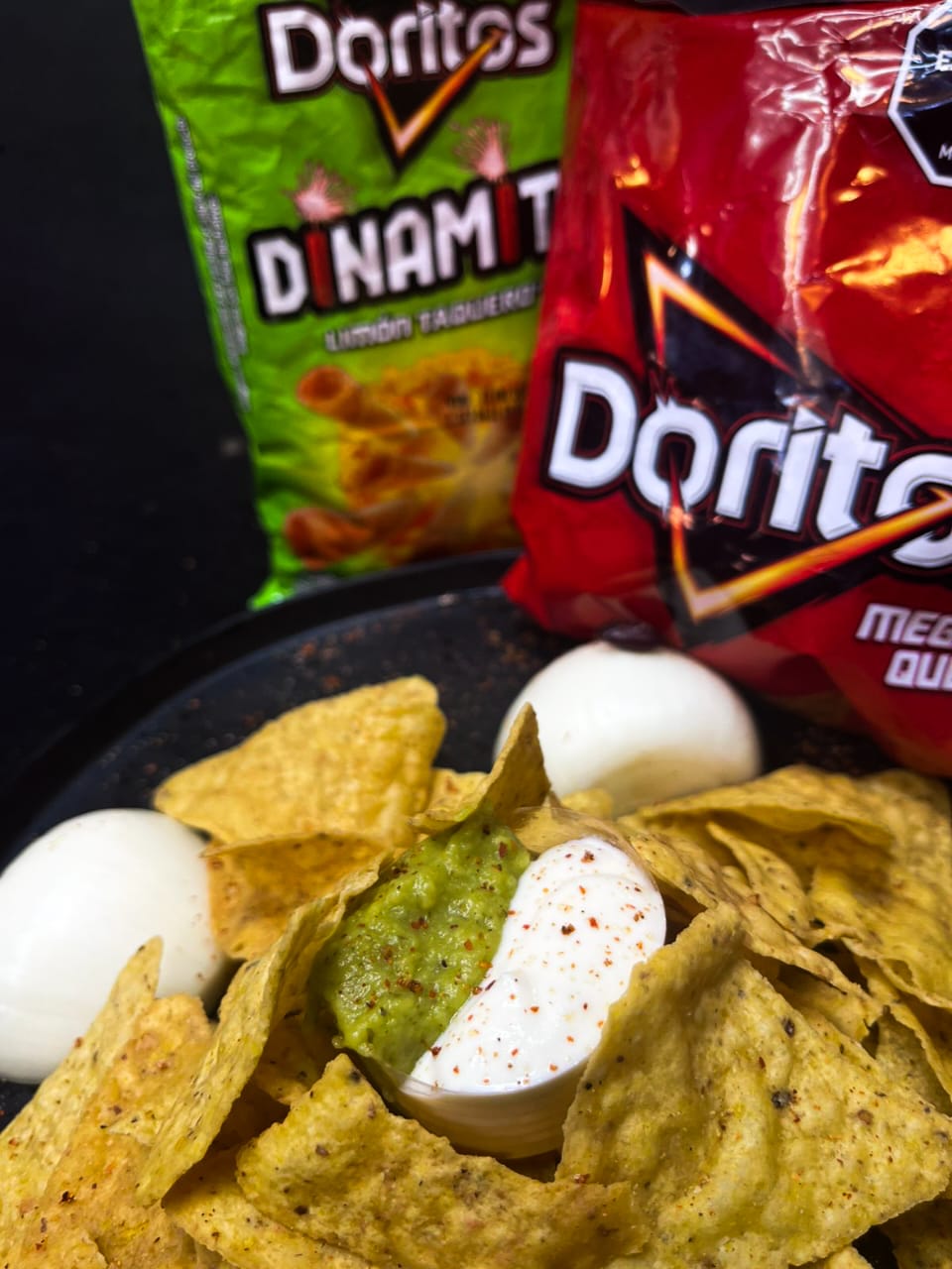 Una bolsa de choclitos de limón clásicos, bañados en nuestra salsa especial de chipotle picante, rellenos de pollo troceado, lechuga, maíz, queso costeño, pico de gallo y guacamole y decorado con Doritos dinamita.