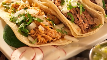 3 deliciosas tortillas blandas rellenas de pollo en trozos grill, lechuga, gratinados en delicioso queso mozzarella, acompañados de aguacate o guacamole, pico de gallo, y suero