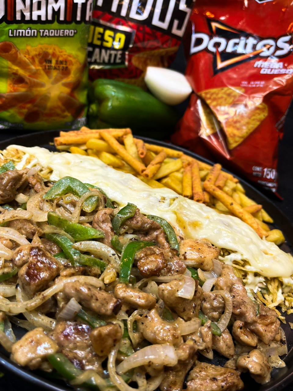 150 g de papas a la francesa, acompañadas de pechuga de pollo grill, pulpa de cerdo, salteado de cebolla y pimentón grille, con un baño de mozzarella gratinado y nuestra salsa gourmet de la casa, decorada con Doritos dinamita.