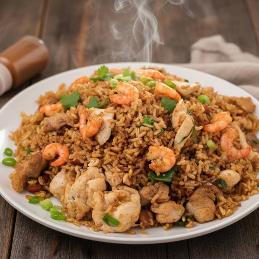 Arroz salteado en wok con pollo, camarón, cerdo, jamón y cebollín.