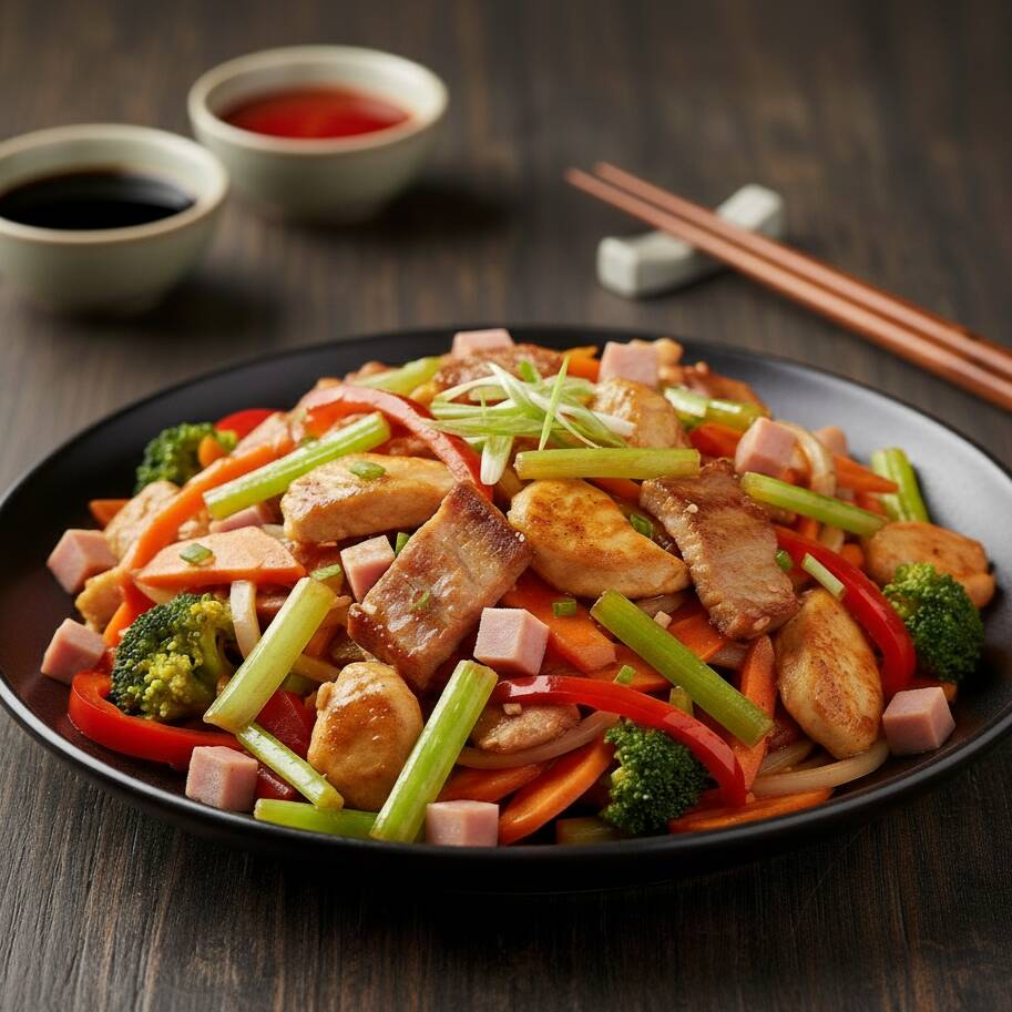 Arroz salteado en wok con Pollo, cerdo, jamón y cebollín.