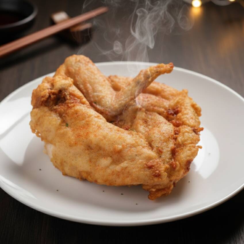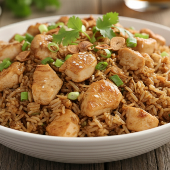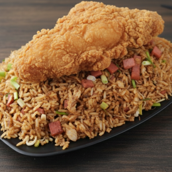 Arroz salteado en wok con jamón, cebollin y pollo apanado.