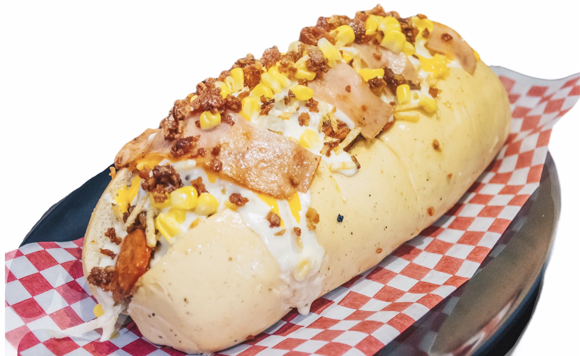 Perro Italiano de pan, salchicha, lechuga, papa chongo, queso mozzarella, jamón, tocineta, maíz tierno y salsa tártara.