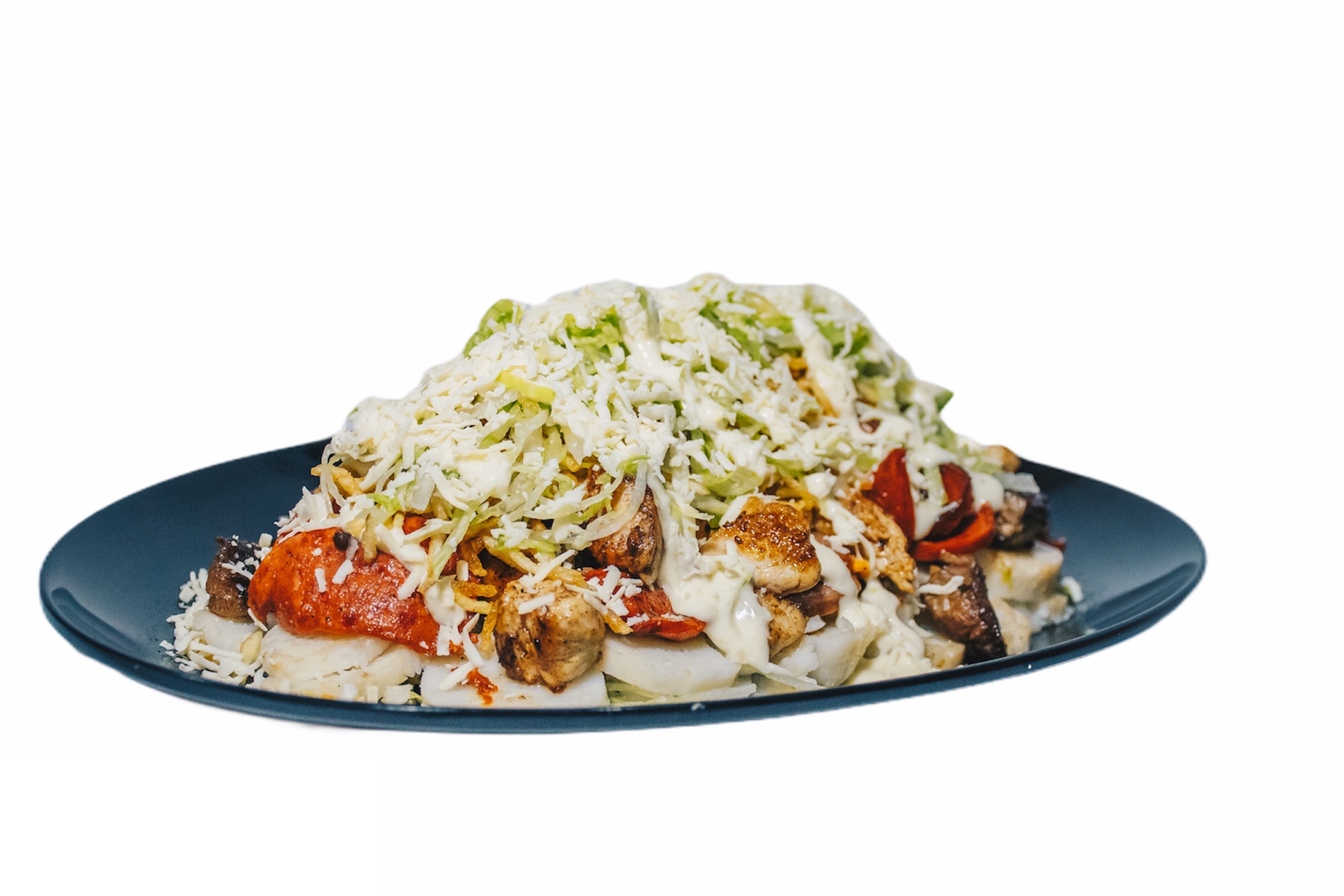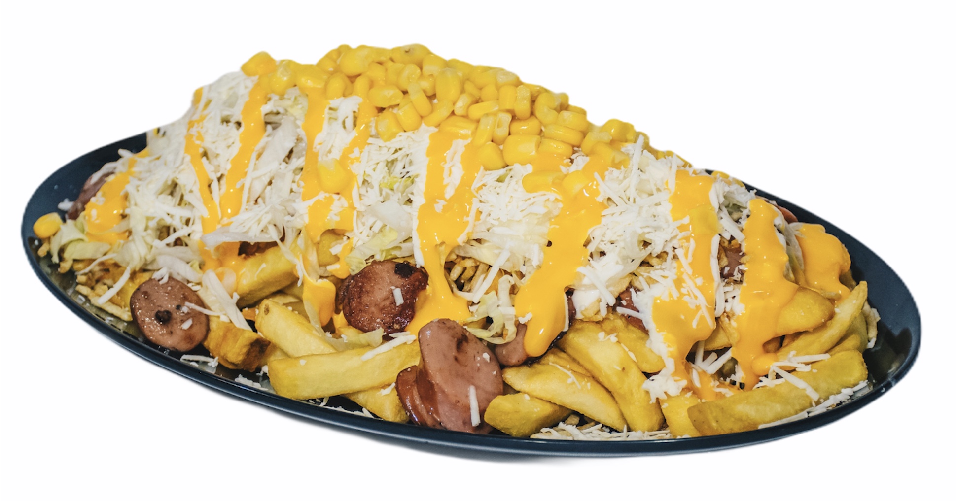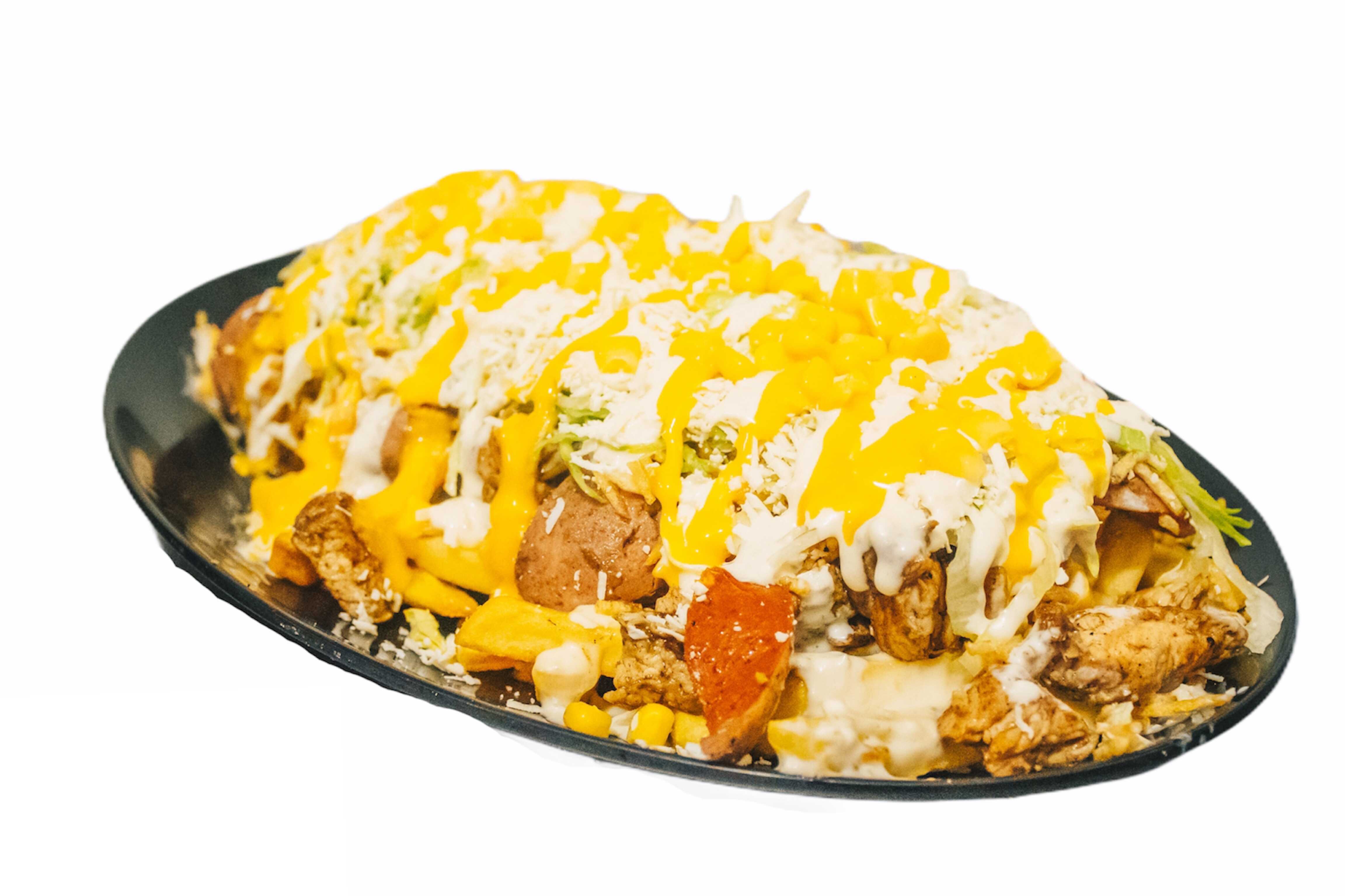 Papas, pollo, chorizo, butifarra, salchicha suiza, queso costeño, lechuga, chongo, maíz, tártara y salsa de queso cheddar.