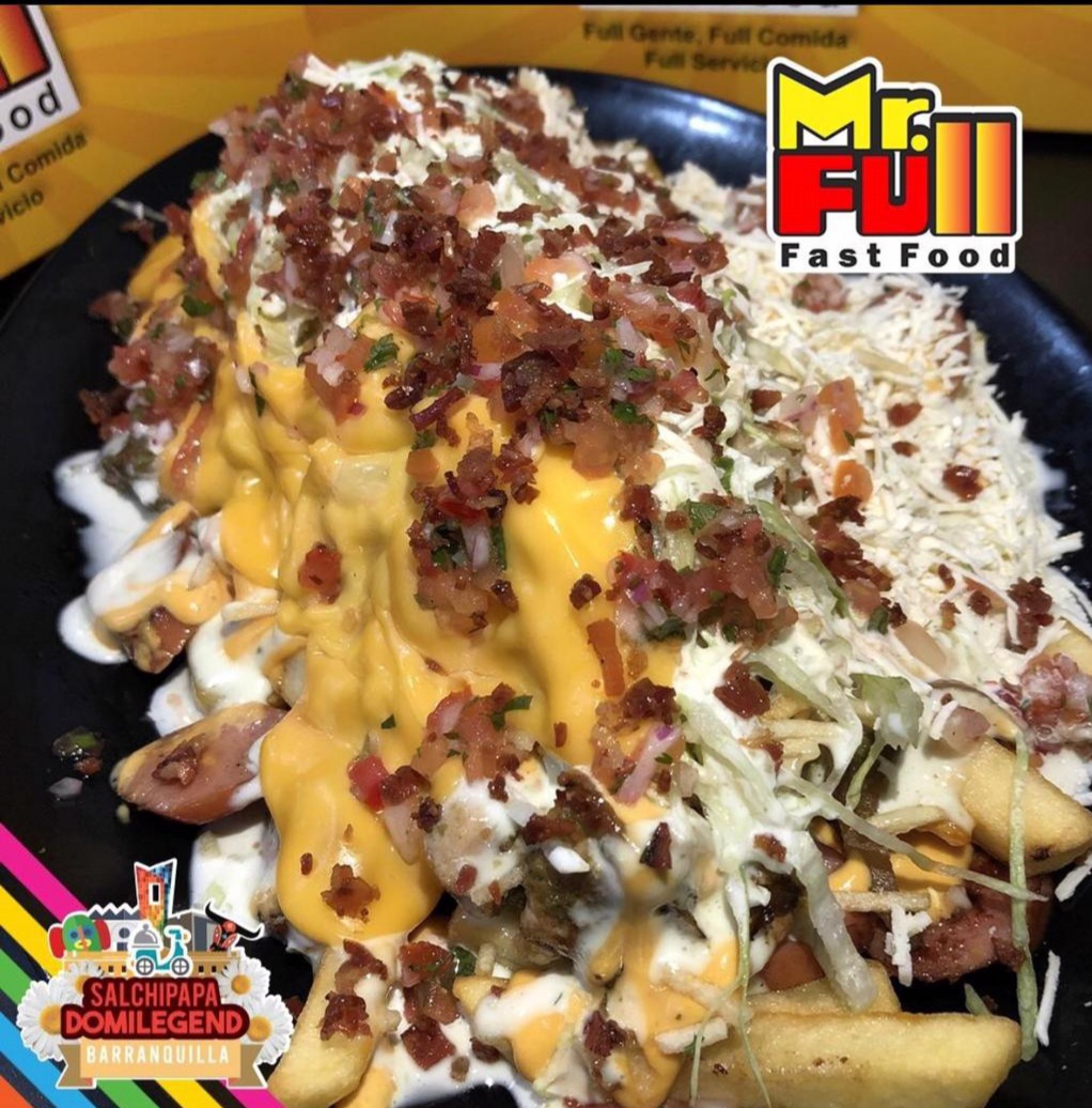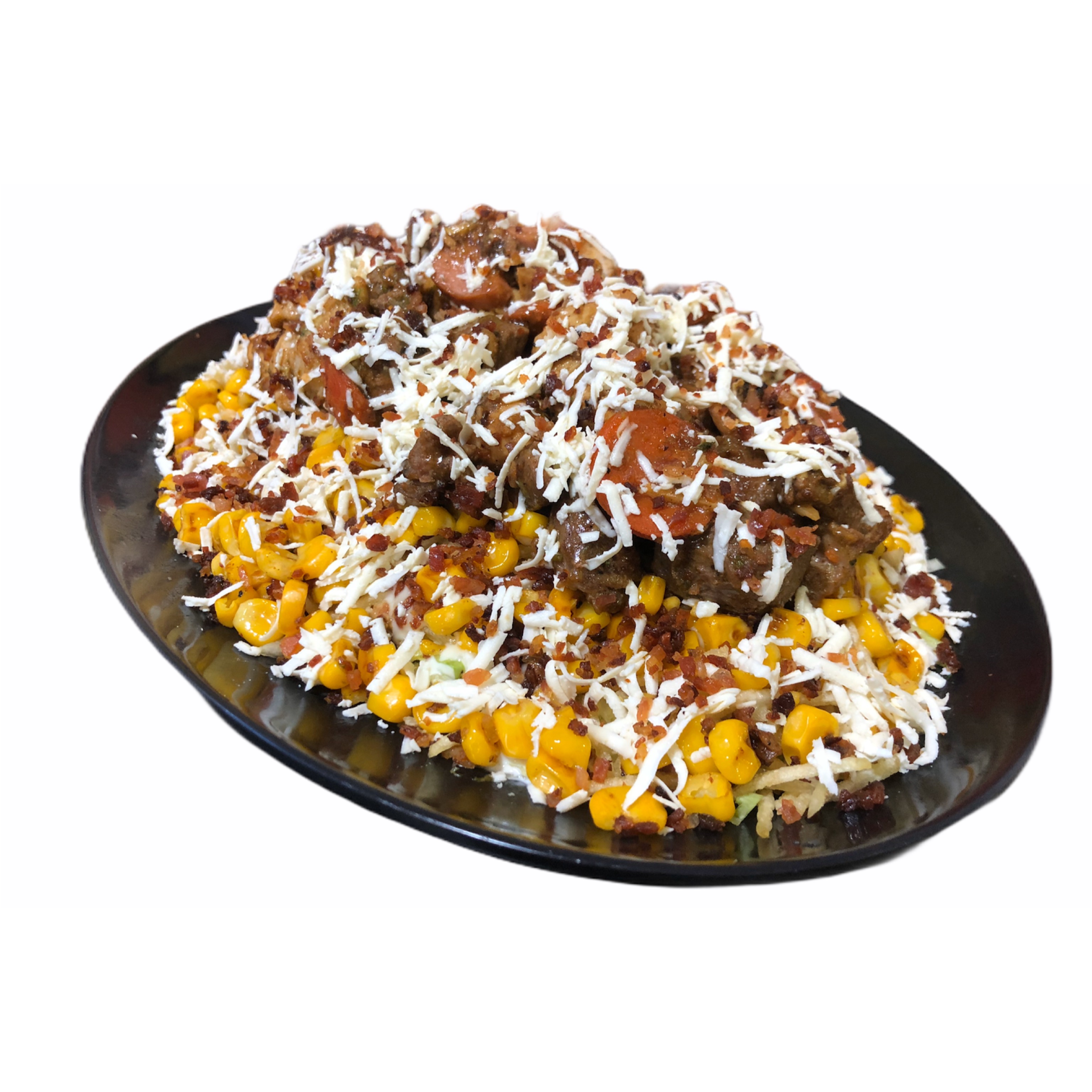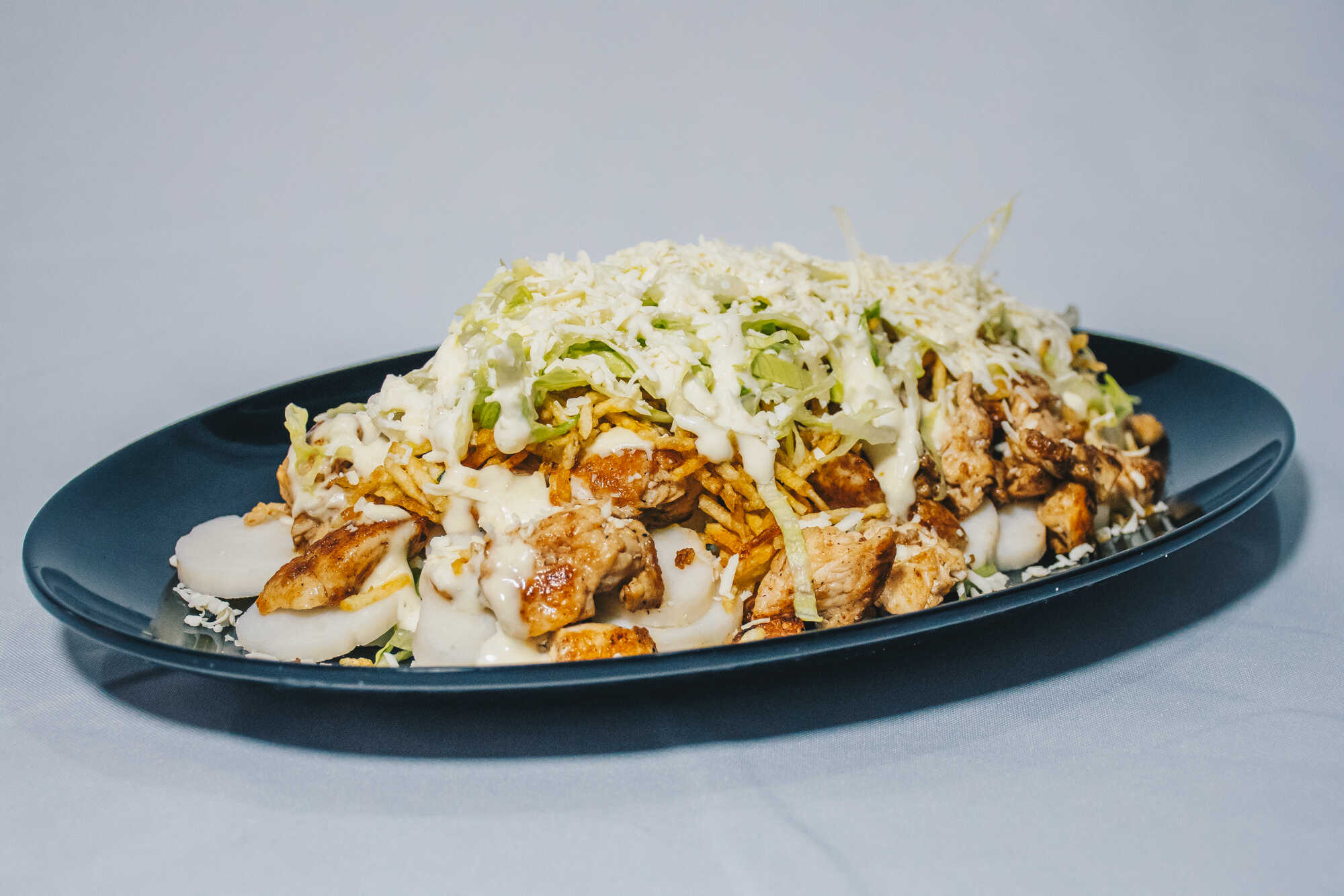 Papas, pollo, chorizo, butifarra, salchicha suiza, queso costeño, lechuga, chongo, maíz, tártara y salsa de queso cheddar.