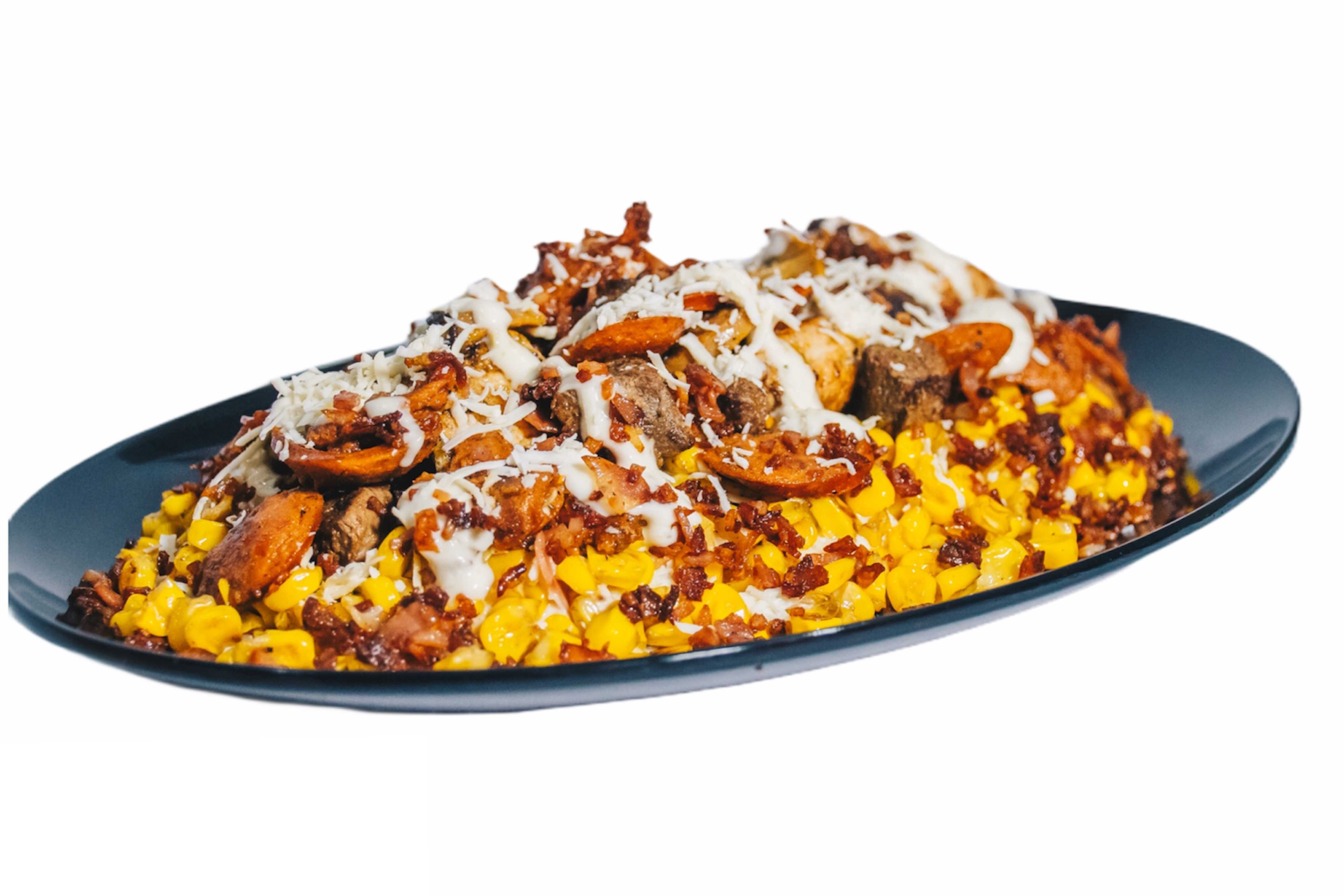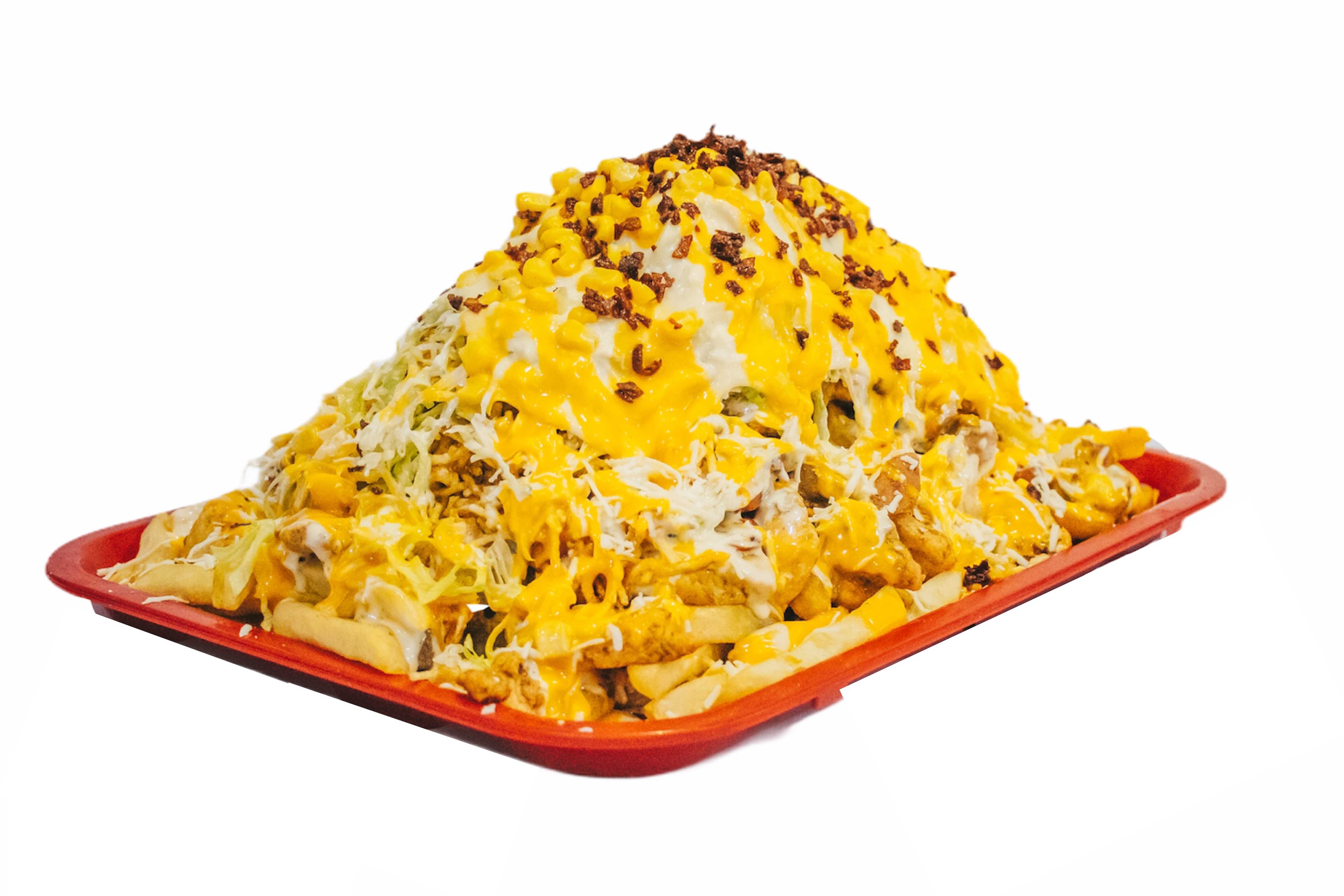 Papas, pollo, chorizo, butifarra, salchicha, papa chongo, lechuga, mozzarella, salsa de queso cheddar, queso criollo, tártara, maíz y tocineta.