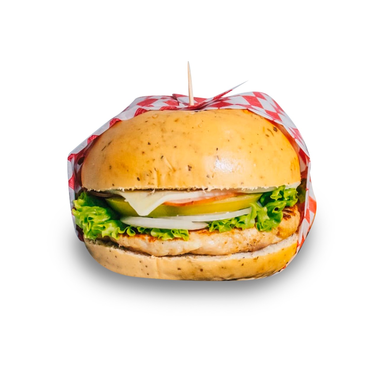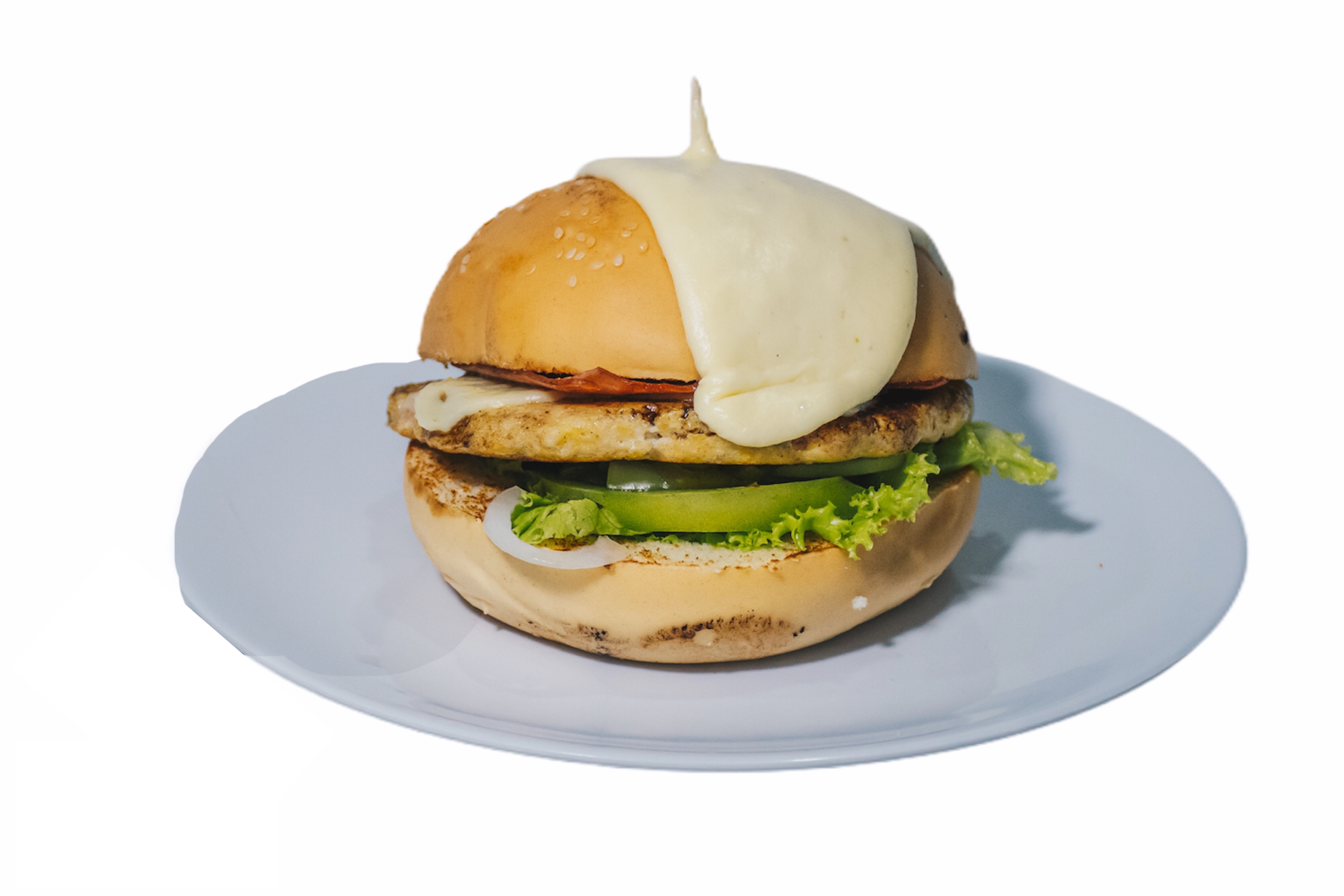 Pan, pollo molido, lechuga, jamón, queso mozzarella, mostaza, tomate, cebolla caramelizada y salsa tártara.