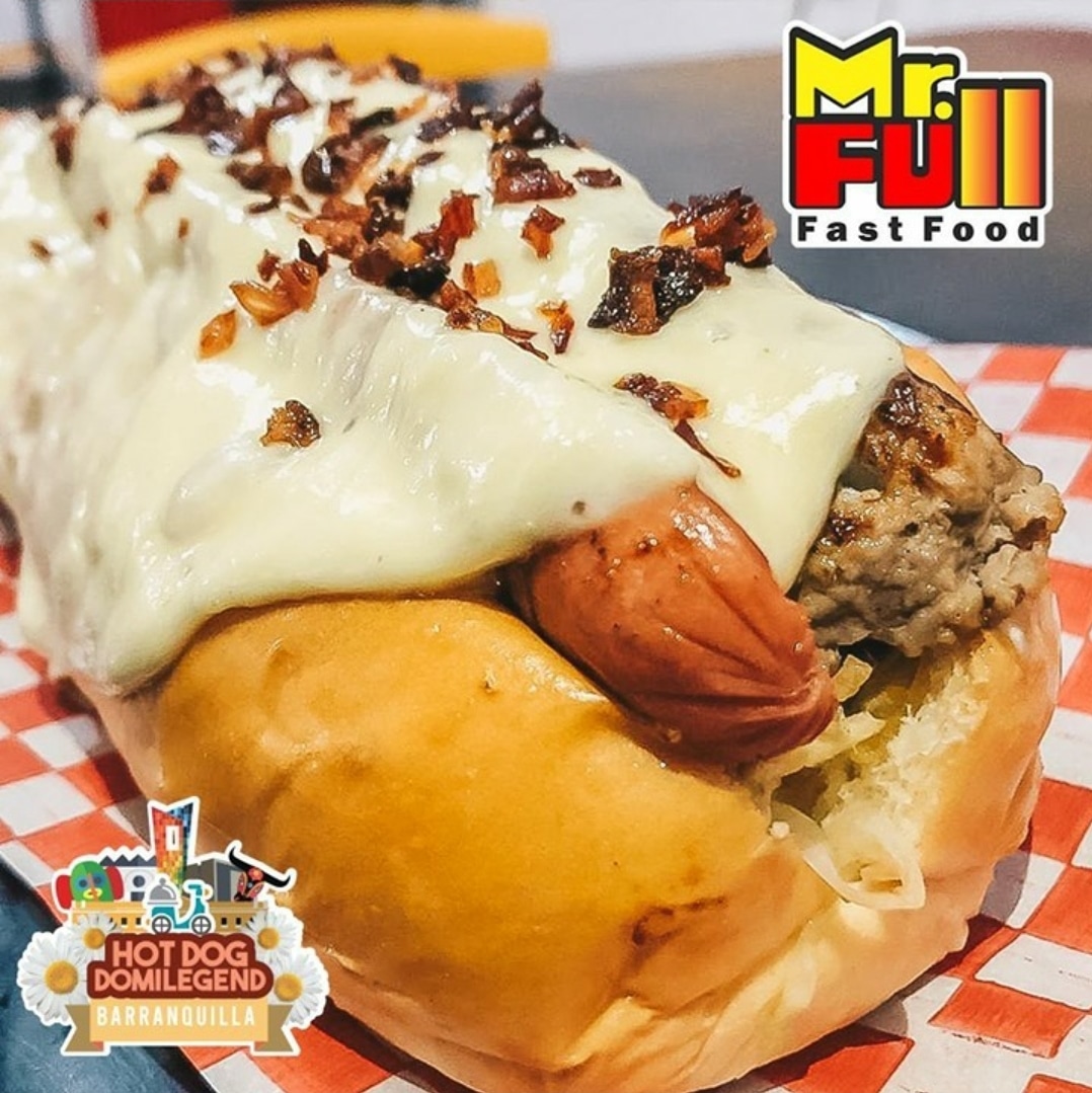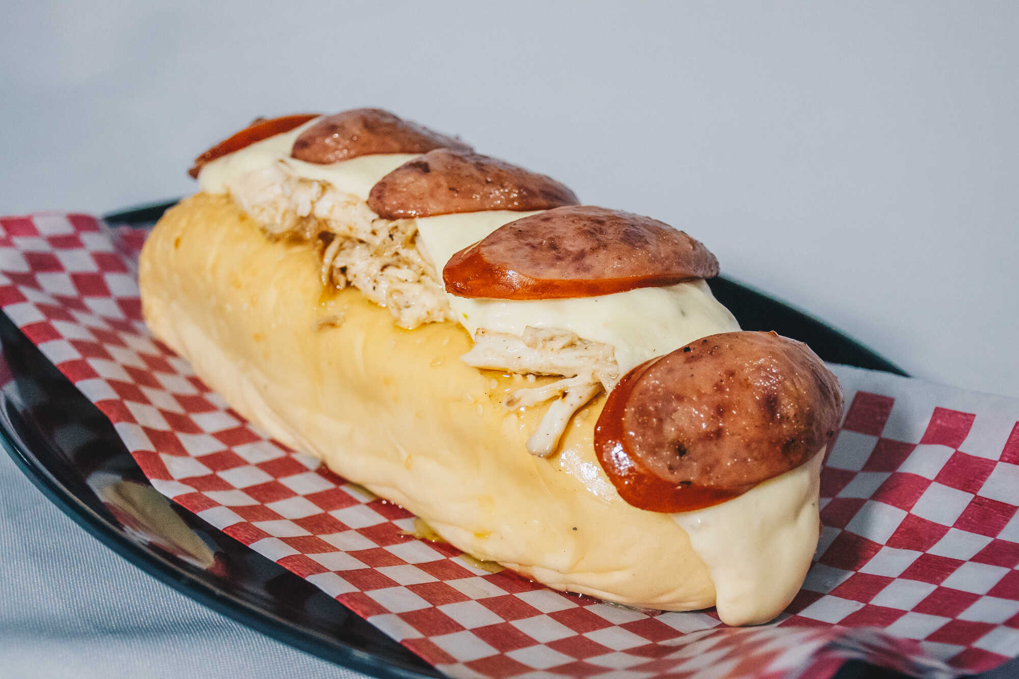 Perro Argentino de pan brioche, lechuga, salsa tártara, rollito de carne especial con mozzarella, salchicha ahumada bañada en salsa BBQ, mozzarella fundido y tocineta.