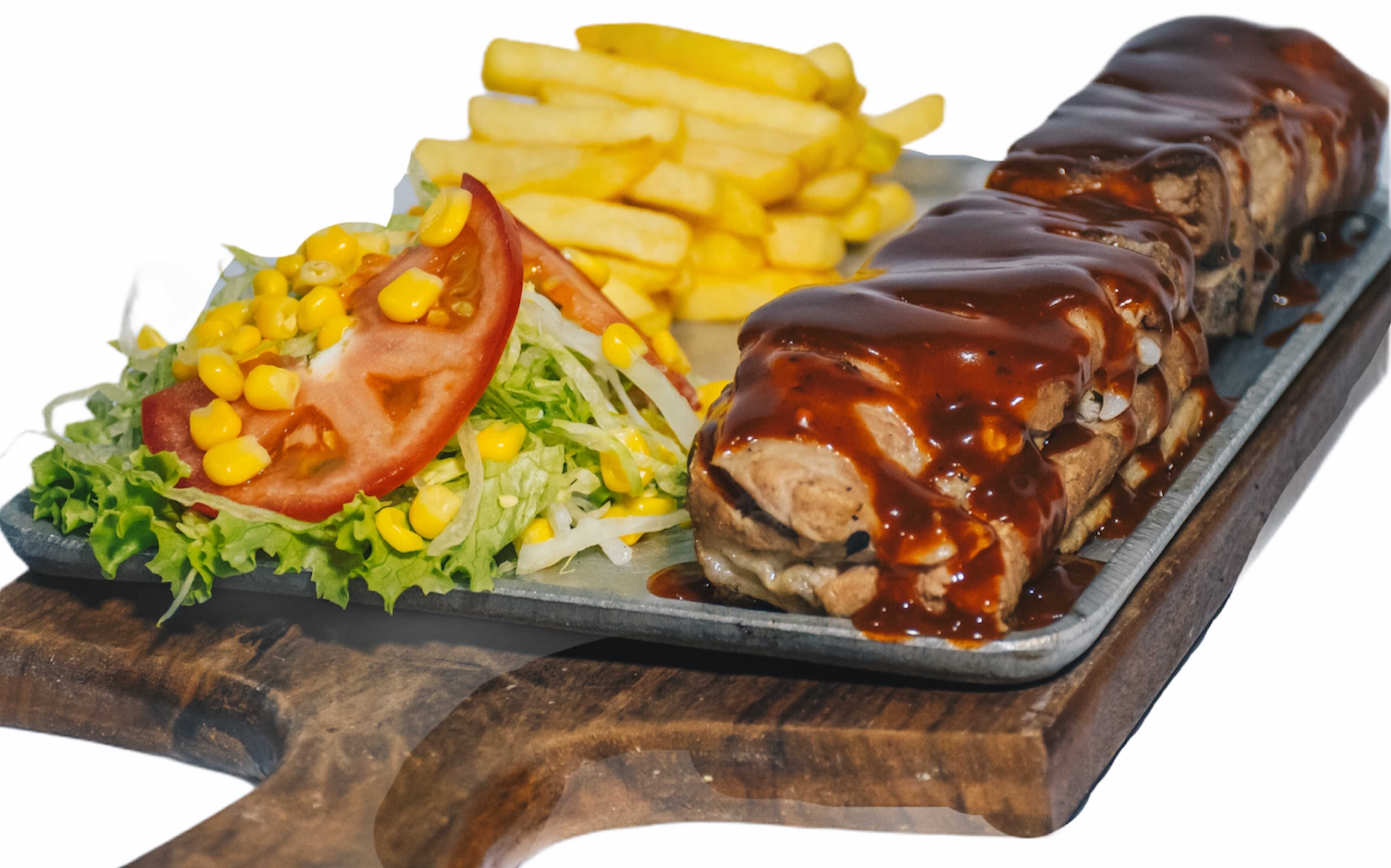 Costillas de cerdo en salsa BBQ y papas, ensalada de lechuga, tomate, maíz y tártara.