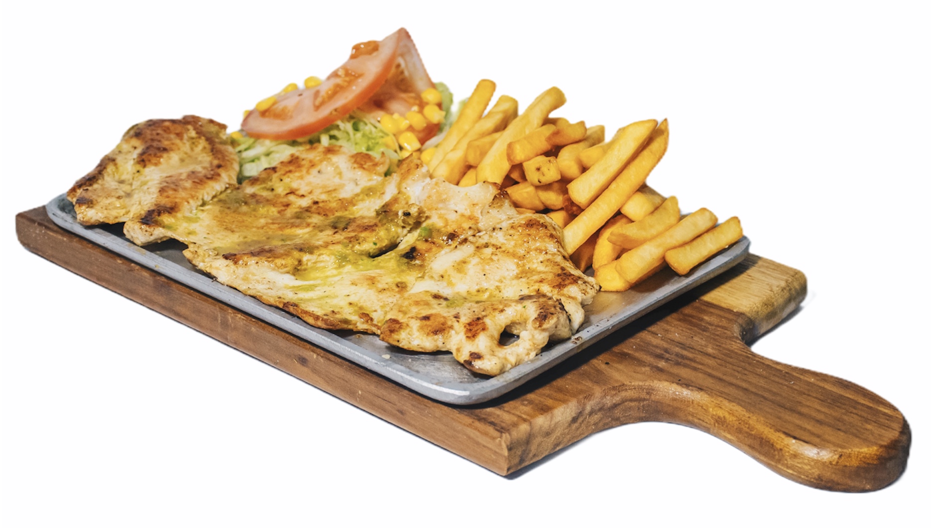 Papas a la francesa, carne, pollo, papa chongo, lechuga, queso criollo y salsa tártara.