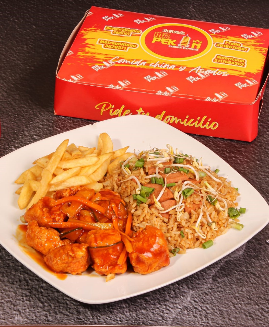 Pechuga en cubos en salsa a la naranja + arroz de jamón + papas a la francesa + bebida 250 ml (sabor a disponibilidad)