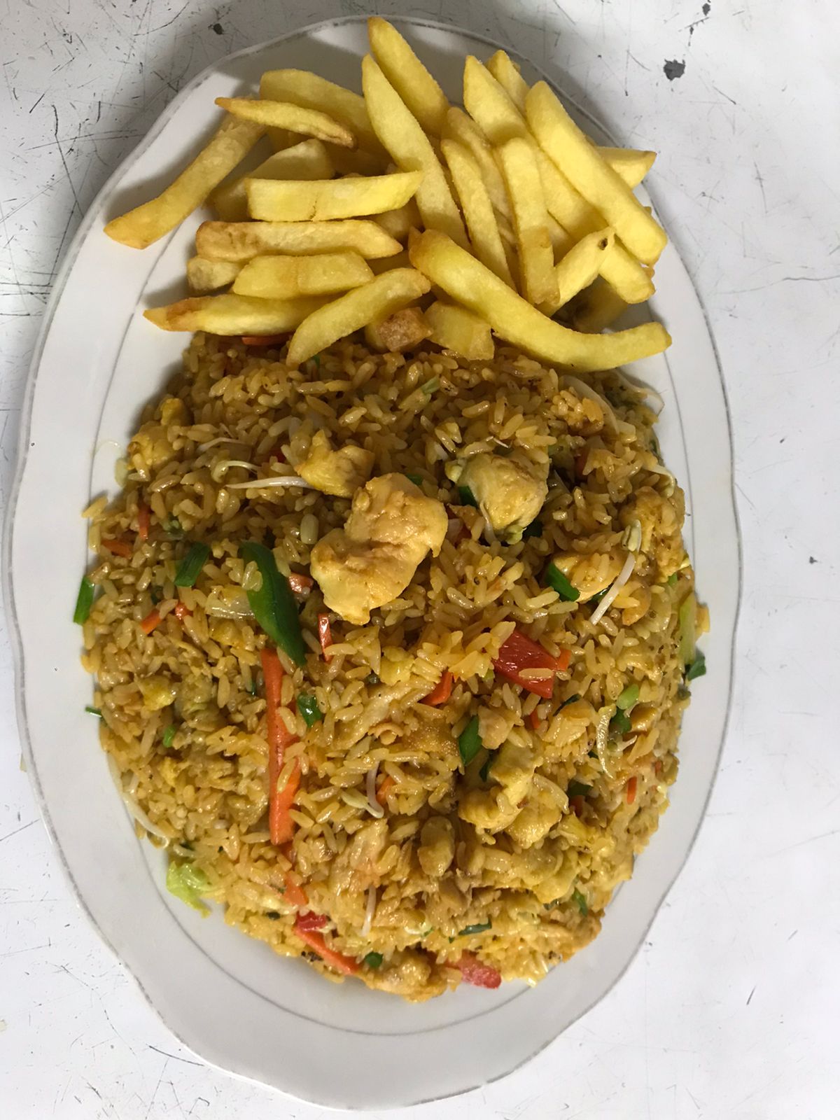 Arroz con verduras especiales de la casa y con proteínas de pollo troceados y verduras ( pimentón, cebolla y zanahorias) + Papas a la francesa (Plato para dos personas)