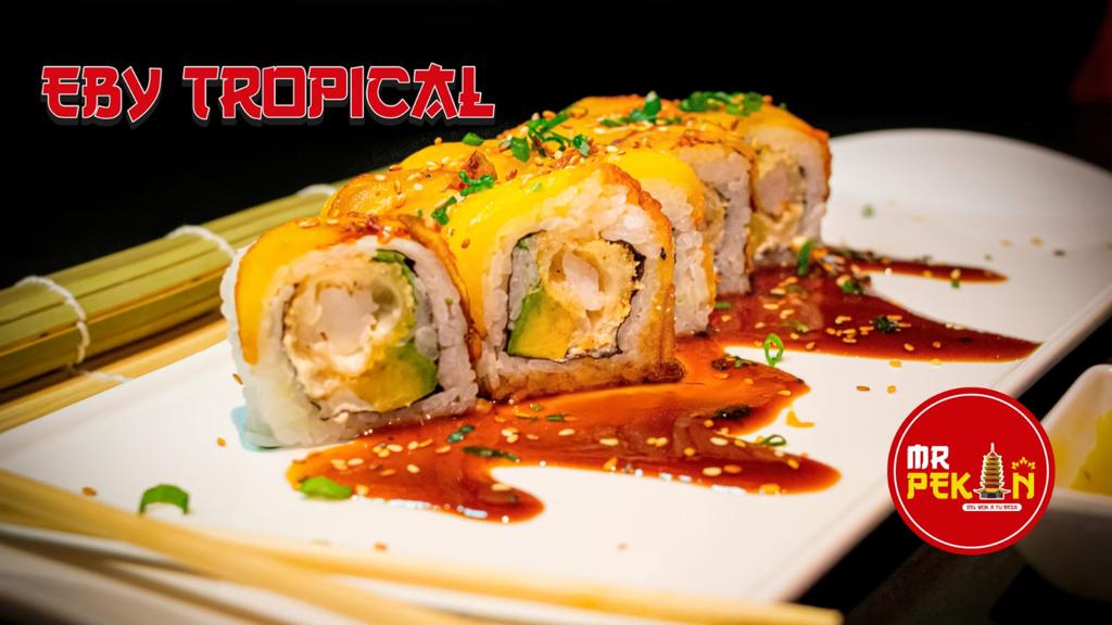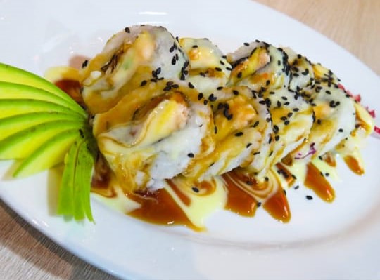 Tiger Roll (RELLENO DE SALMON FRESCO,AGUACATE Y QUESO CREMA SALSA DE MELOCOTON Y TERIYAKI +Dinamita Tempura, palmito, aguacate, queso crema