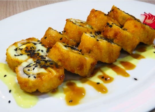 Roll bocado a bocado, palmito de cangrejo apanado, aguacate y queso crema. bañado en salsas de la casa
