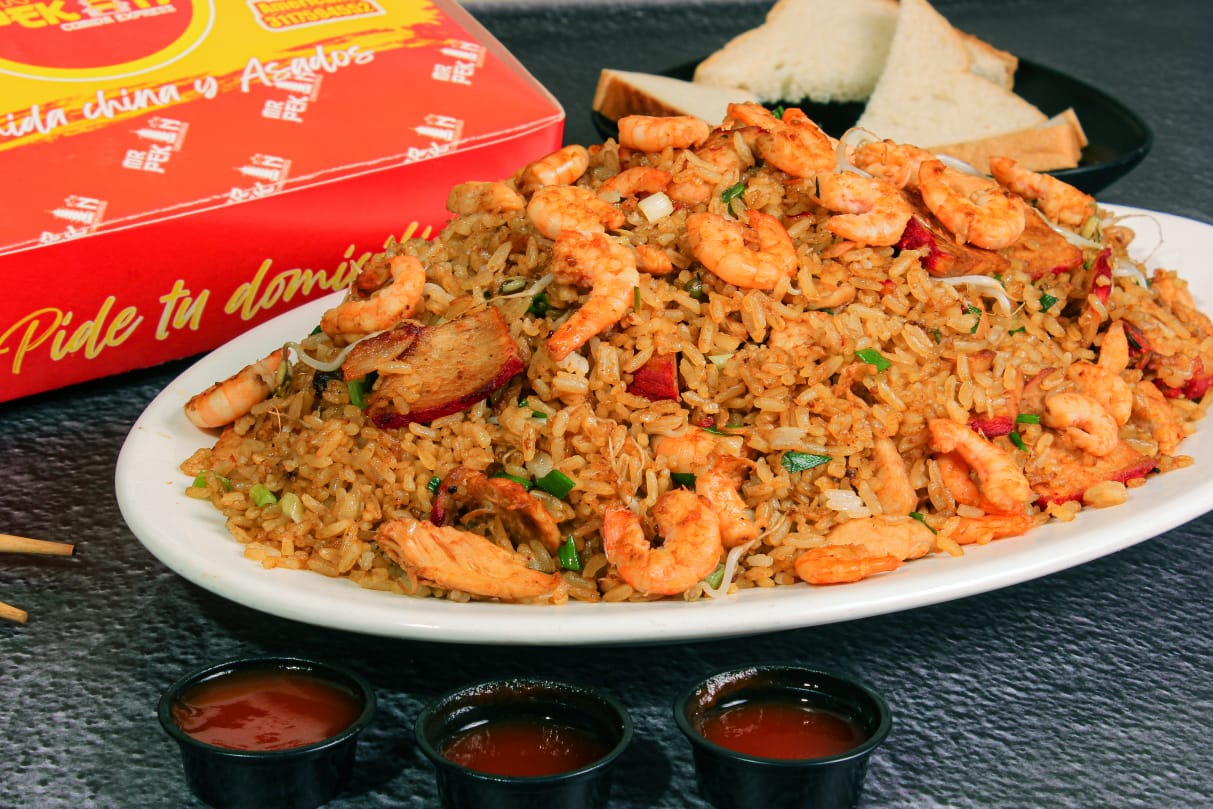 Arroz sofrito, con proteínas pollo + cerdo + camarón . Acompañado con 4 presas de pollo a la broaster (plato para 4 personas)+UNA LITRO1.5