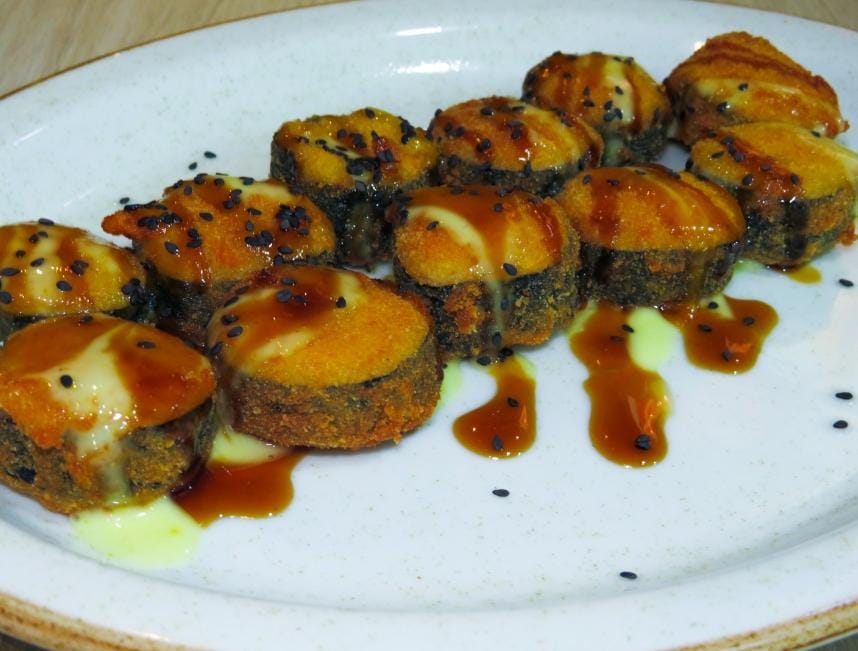10 bocados rellenos de salmón fresco, aguacate, queso crema y cebollin. topping: ajonjoli + RELLENO DE PALMITO DE CANGREJO APANADO, AGUACATE Y QUESO CREMA SALSA DE MELOCOTON Y TERIYAKI