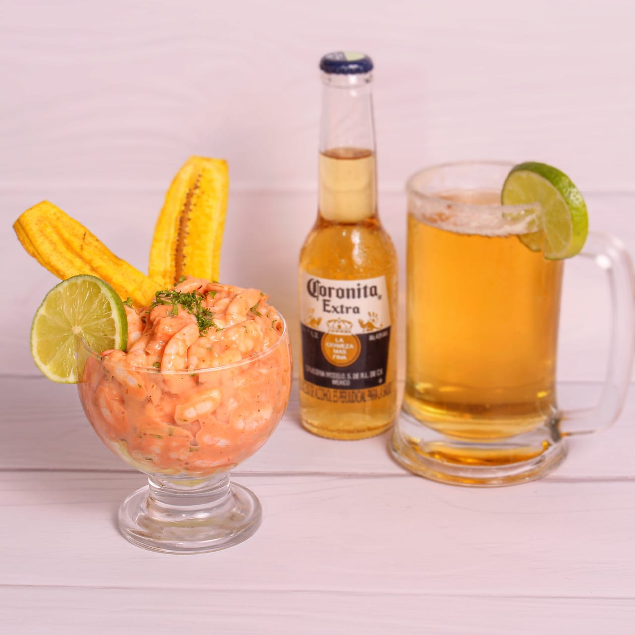 Camaron con salsa rosada de la casa, cebolla picada, ramas de cilantro con chile serrano y jugo de limón, chips de platano.