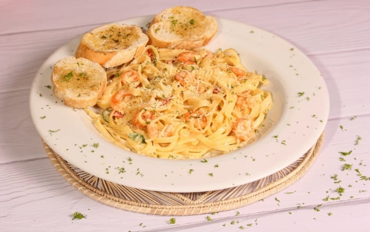 Pastas en crema de leche salteados con camarón y pancitos (personal)