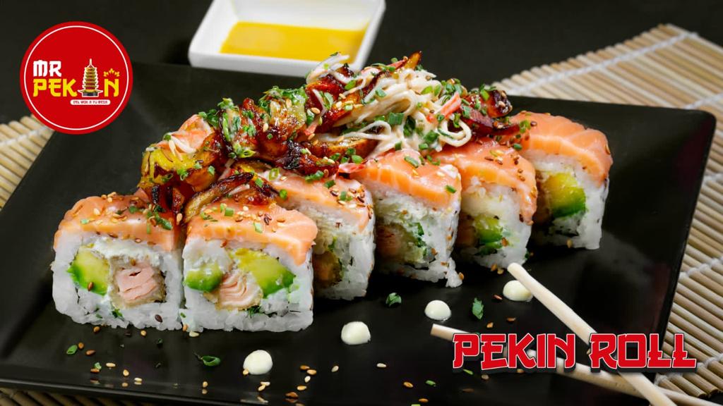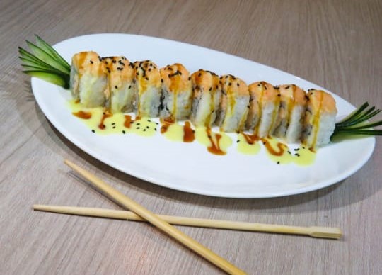 Tiger Roll (RELLENO DE SALMON FRESCO,AGUACATE Y QUESO CREMA SALSA DE MELOCOTON Y TERIYAKI +Dinamita Tempura, palmito, aguacate, queso crema