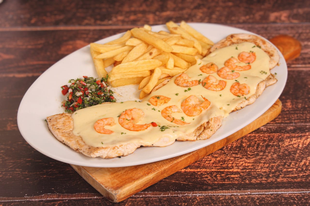 Pechuga gratinada con camarón, acompañada de papas a la francesa y ensalada