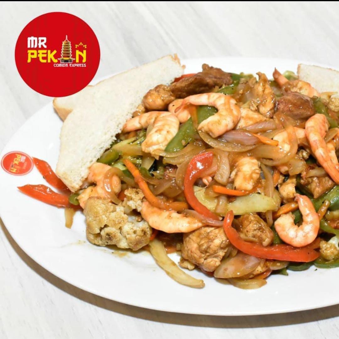 Tallarines salteados con pollo, cerdo y camaron. Zanahoria, pimentón, apio salteados con salsa de soya y ostras. Viene con salsa blanca, parmesano y con pancitos.