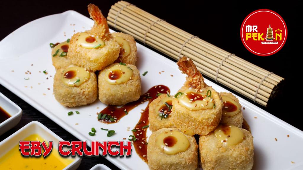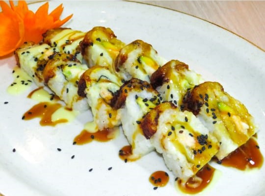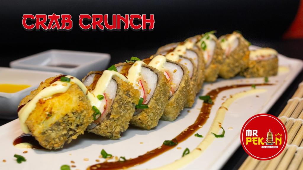 10 bocados de langostinos apanados, aguacate, queso crema, y cebollin. topping: cangrejo crocante bañado en salsa fuji.