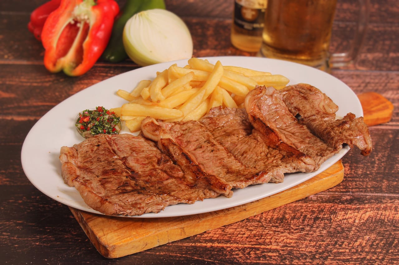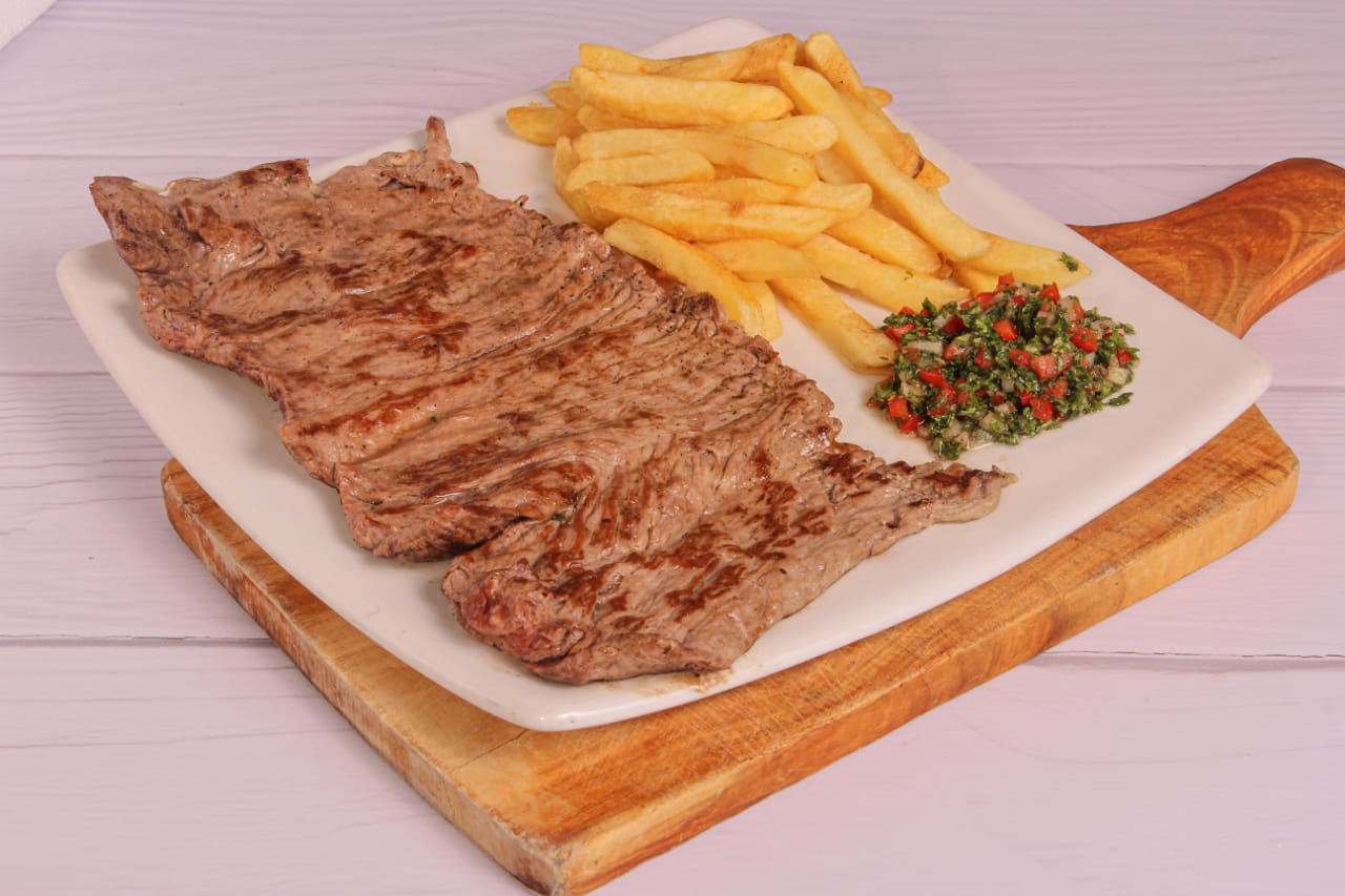 Lomo fino con acompañamiento a elección (papas fritas, papa cocida o bollo), ensalada y salsa de ajo de la casa.