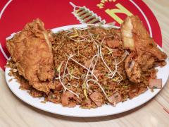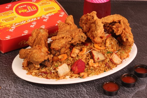 Arroz sofrito, con proteínas pollo + cerdo + camarón . Acompañado con 4 presas de pollo a la broaster (plato para 4 personas)