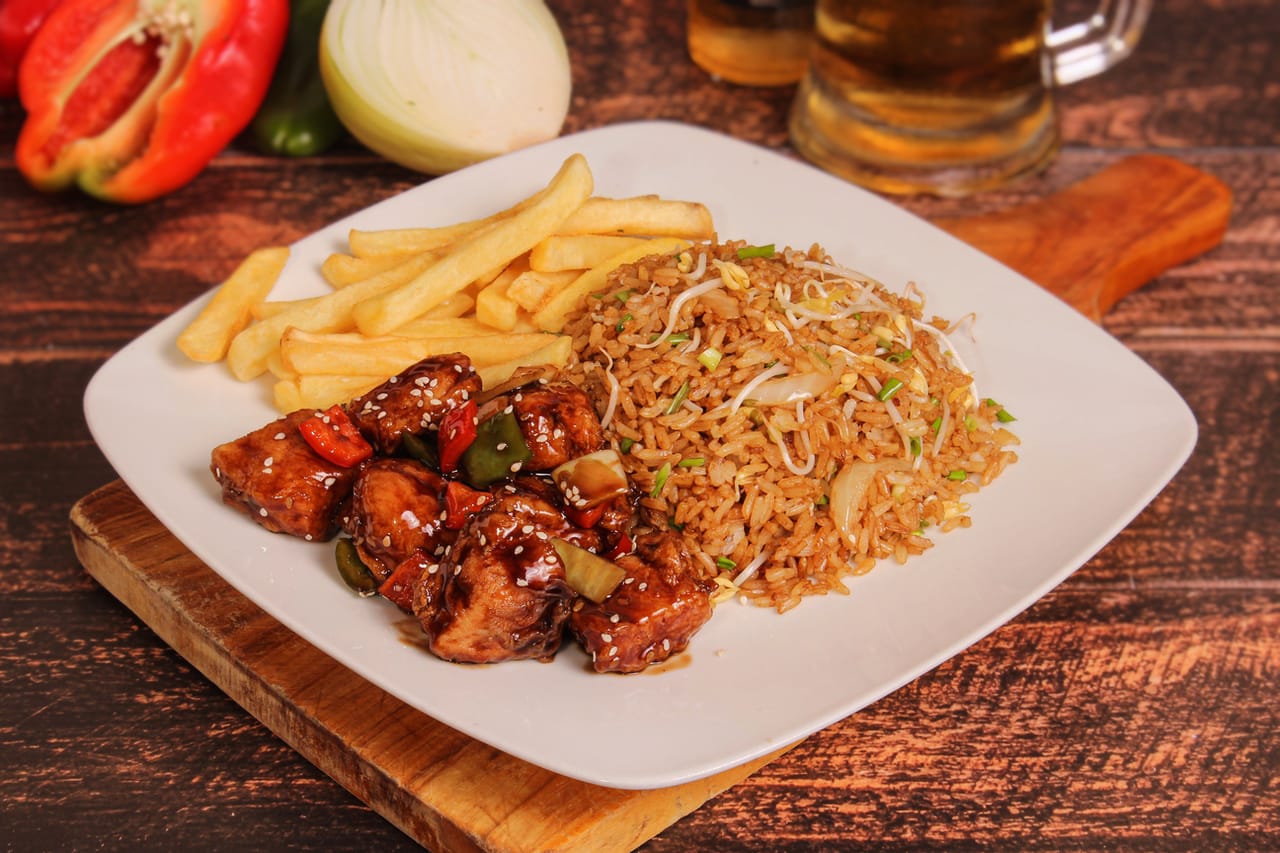 Pechuga en cubo con salsa Teriyaki + Arroz frito Porción + 200gr Papas a la francesa