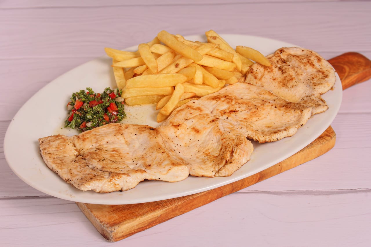 350GR DE Pechuga Especial acompañado de papas fritas y ensalada