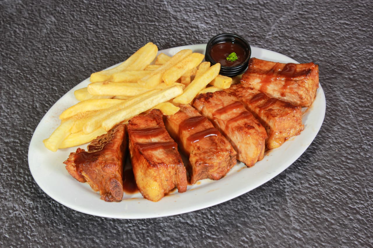 Costillitas de cerdo BBQ, acompañadas de papas fritas y ensalada