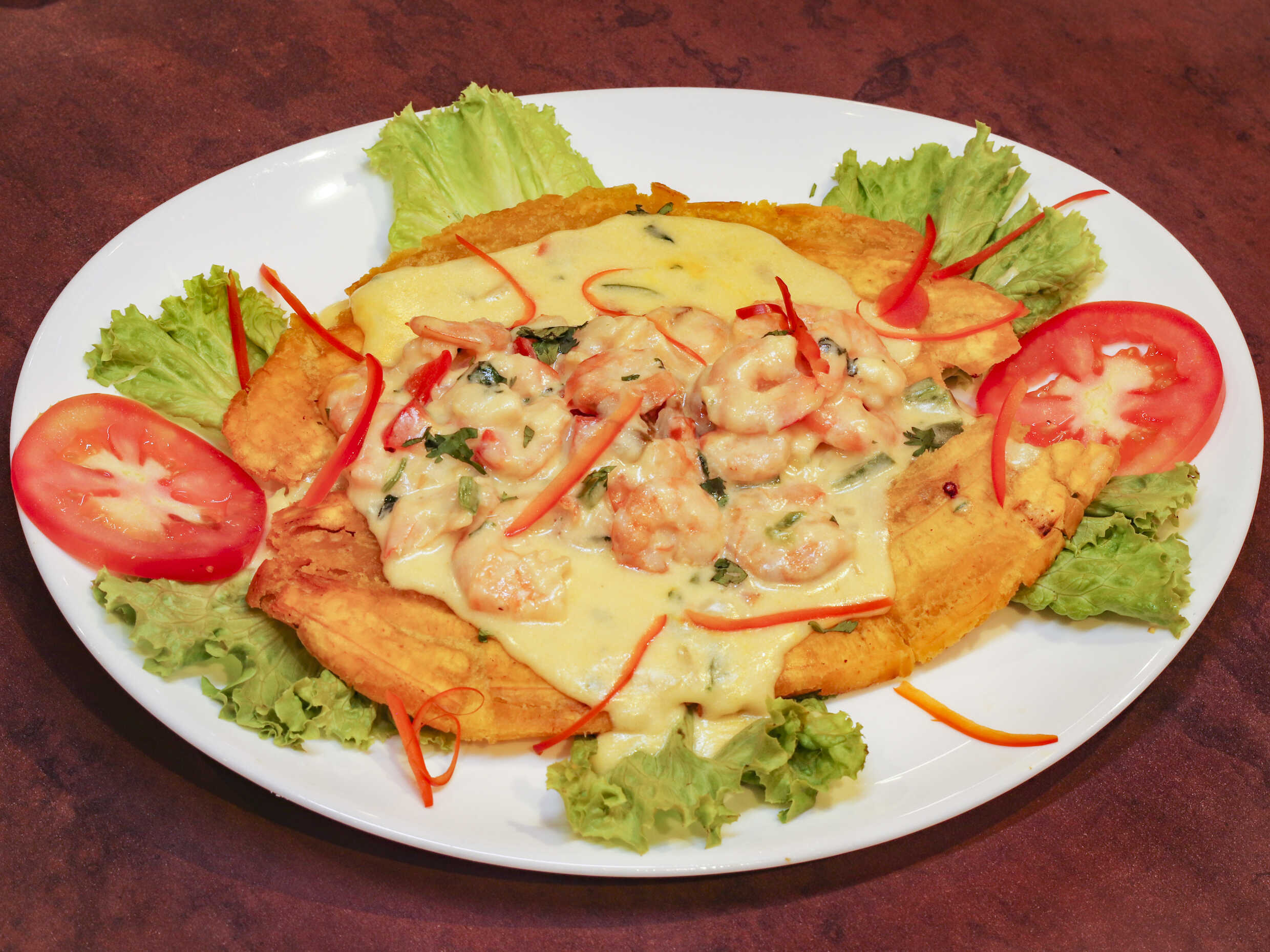Patacones con proteina de camarón y papa chongo con salsas taratara y salsa de tomate, acompañado de queso.