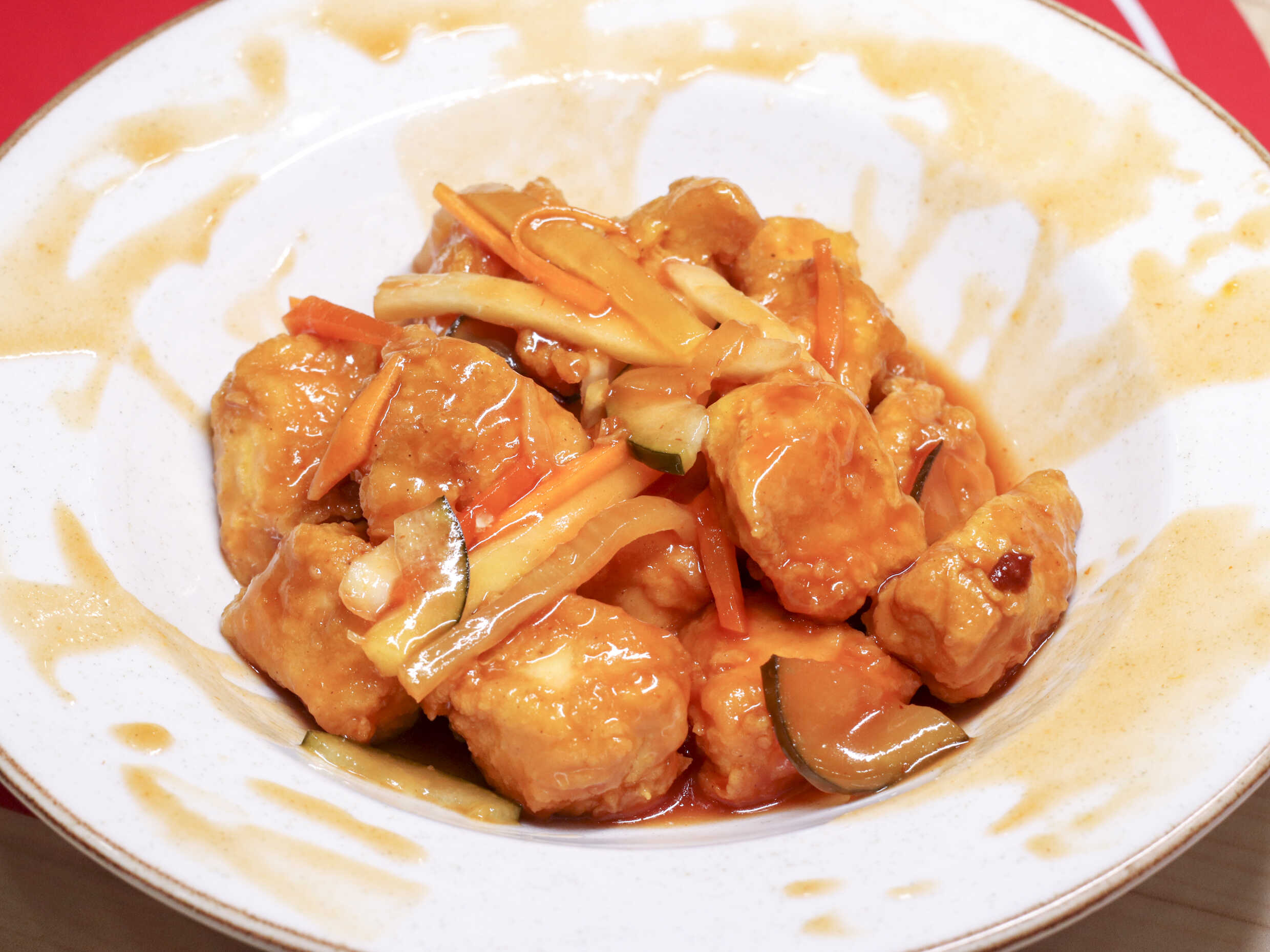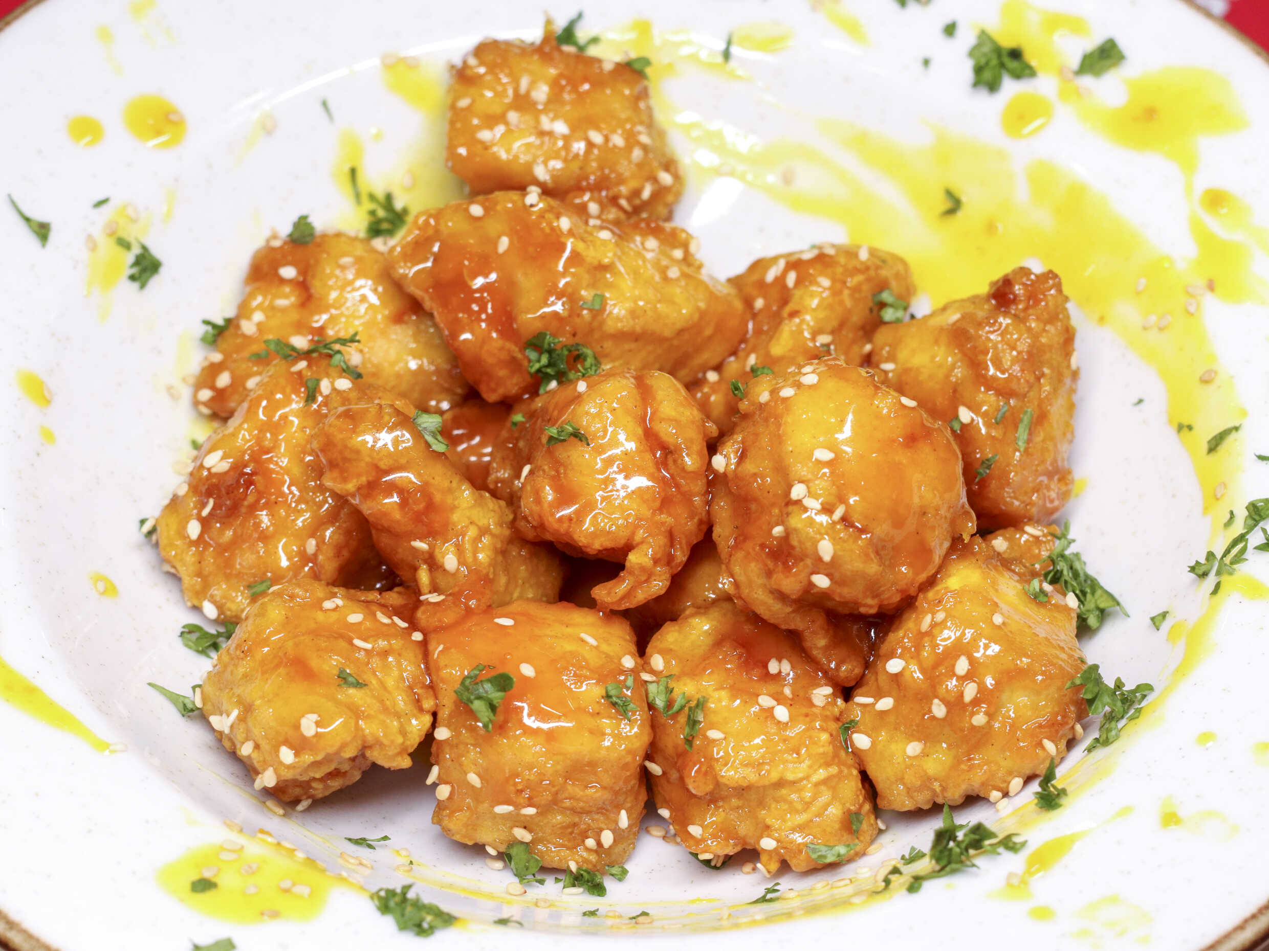 300 GR DE NUGGETS BAÑADOS EN SALSA NARANJA. NO TRAE ACOMPAÑANTES