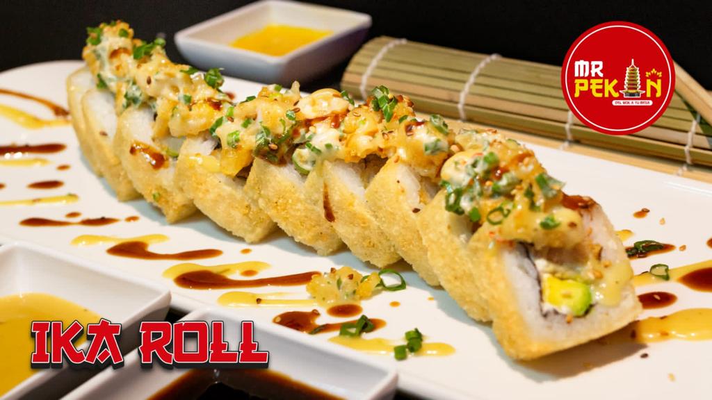 10 bocados de tilapia crocante, aguacate, queso crema, topping: aros de calamar apanados en salsa spicy , fuji y teriyaki