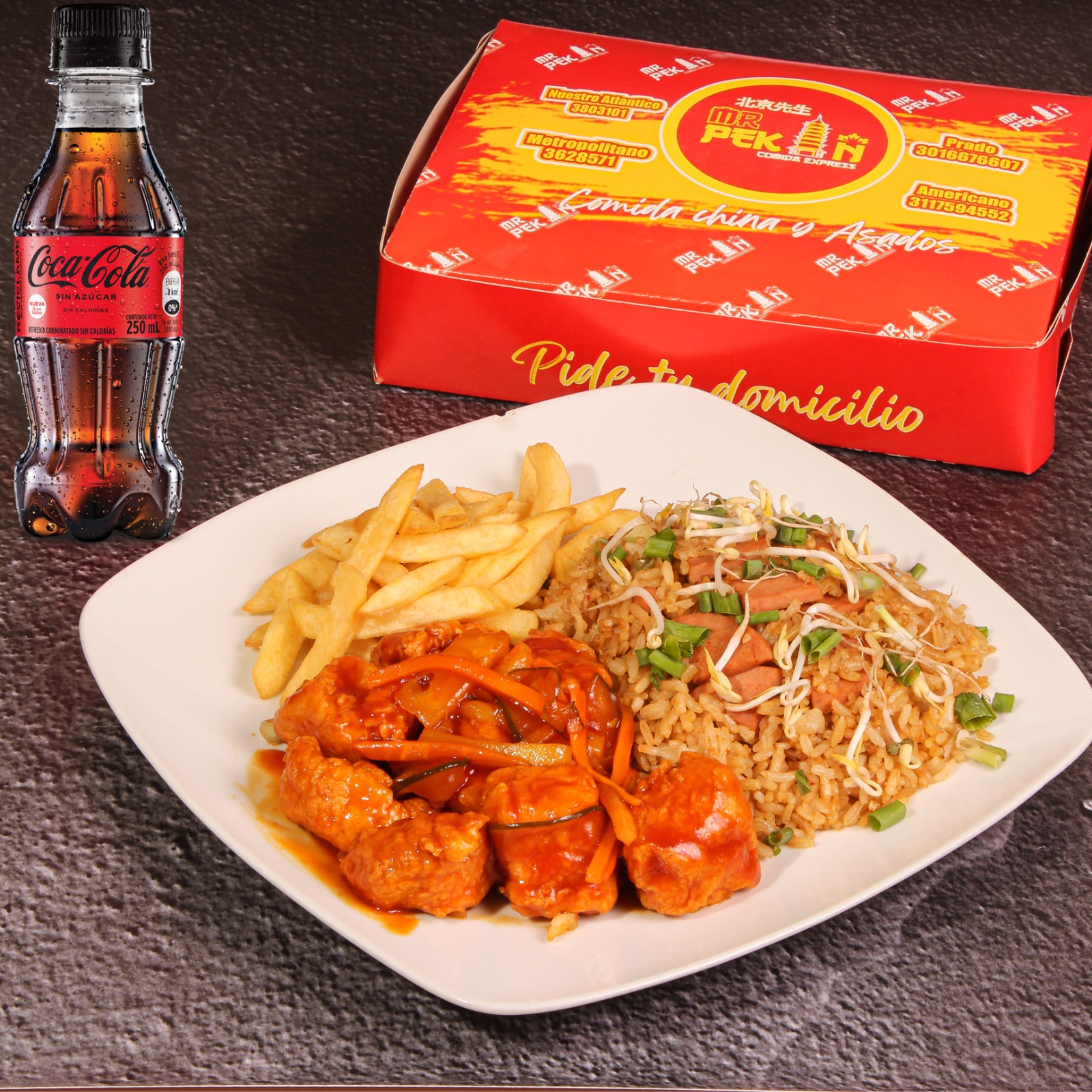 Pechuga en cubos con salsa agridulce + arroz de jamón porción + Papas a la francesa + Bebida 250ml (Producto Cocacola)