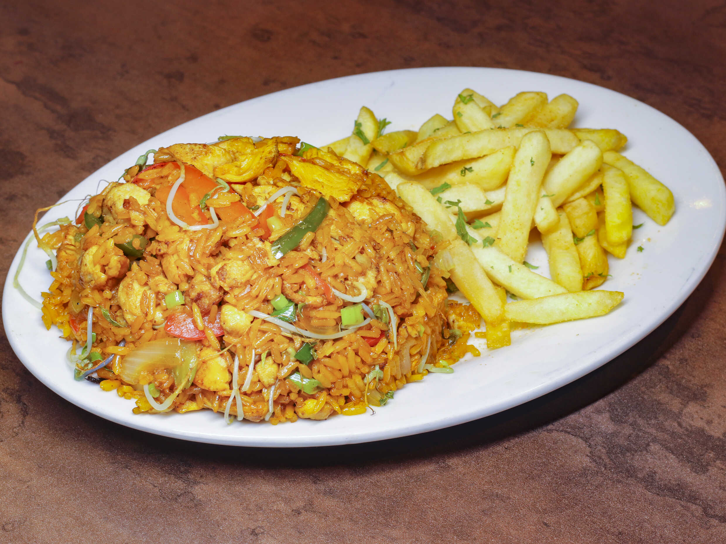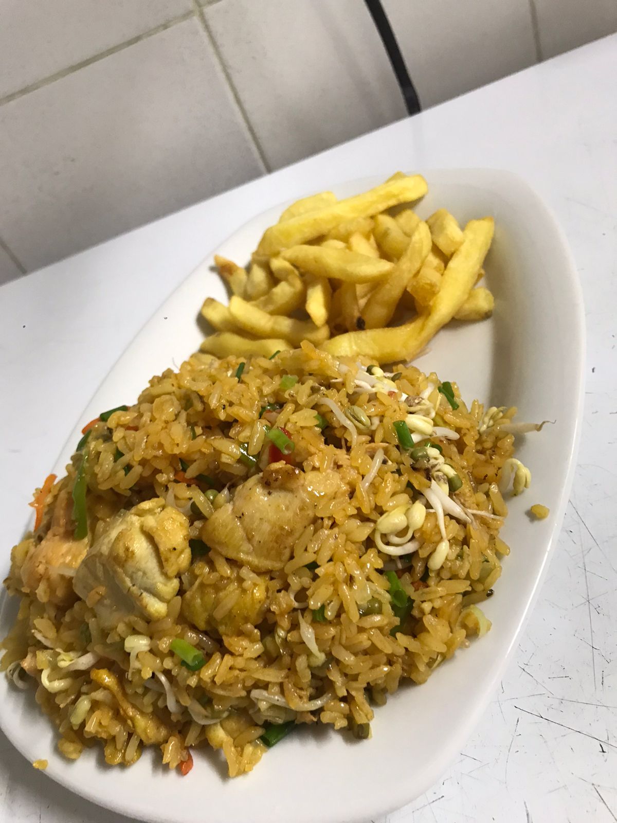 Arroz con proteínas de pollo troceados y verduras ( pimentón, cebolla y zanahorias) + 100gr papas a la francesa