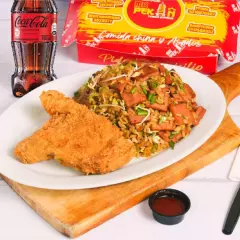 Arroz sofrito, con proteínas camarón + pollo + cerdo troceados. Acompañado con presas de pollo a la broaster (plato para dos personas)