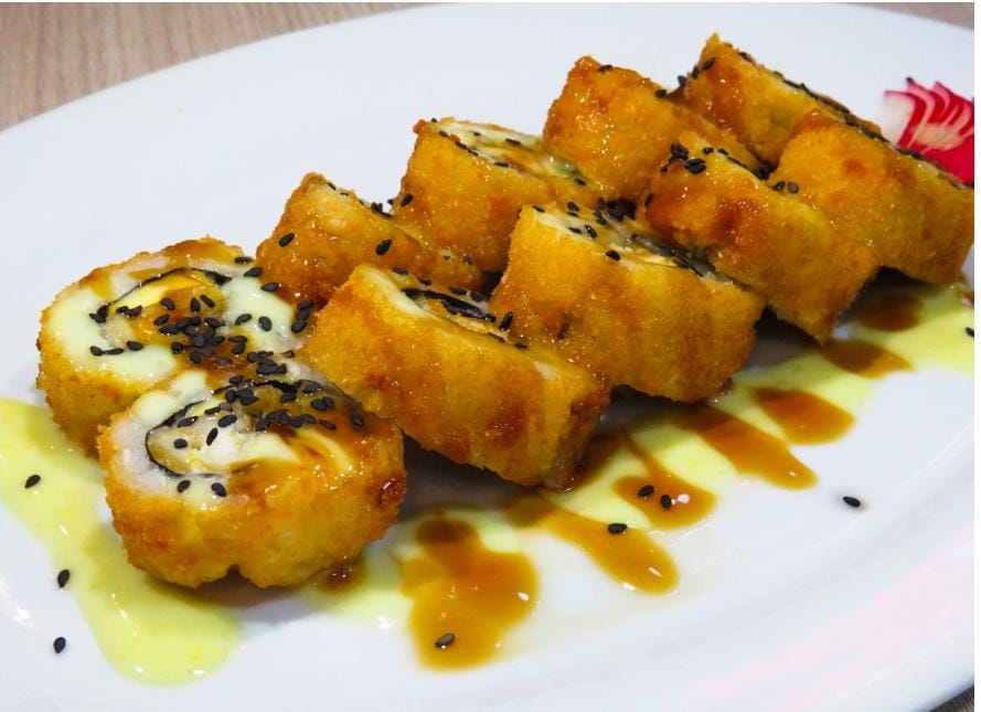 10 bocados dinamita: relleno de crema palmito aguacate , queso crema , topping: plátano maduro