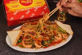 Tallarines salteados con pollo, cerdo y camaron. Zanahoria, pimentón, apio salteados con salsa de soya, Viene con salsa blanca, parmesano y con pancitos (Para dos personas)