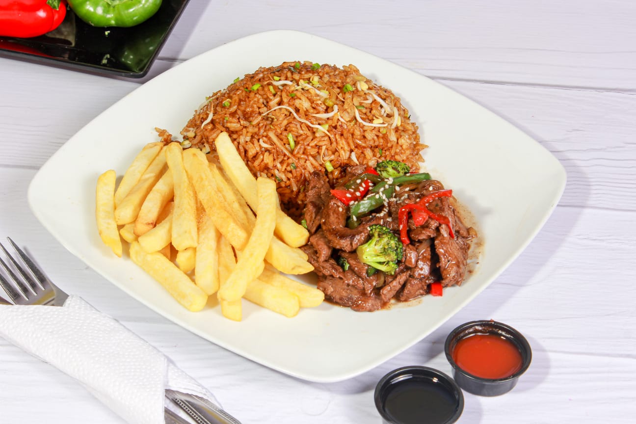 Carne en juliana con salsa teriyaki + Arroz Frito Porción + Papas a la francesa acompañado de bebida gaseosa 250ml