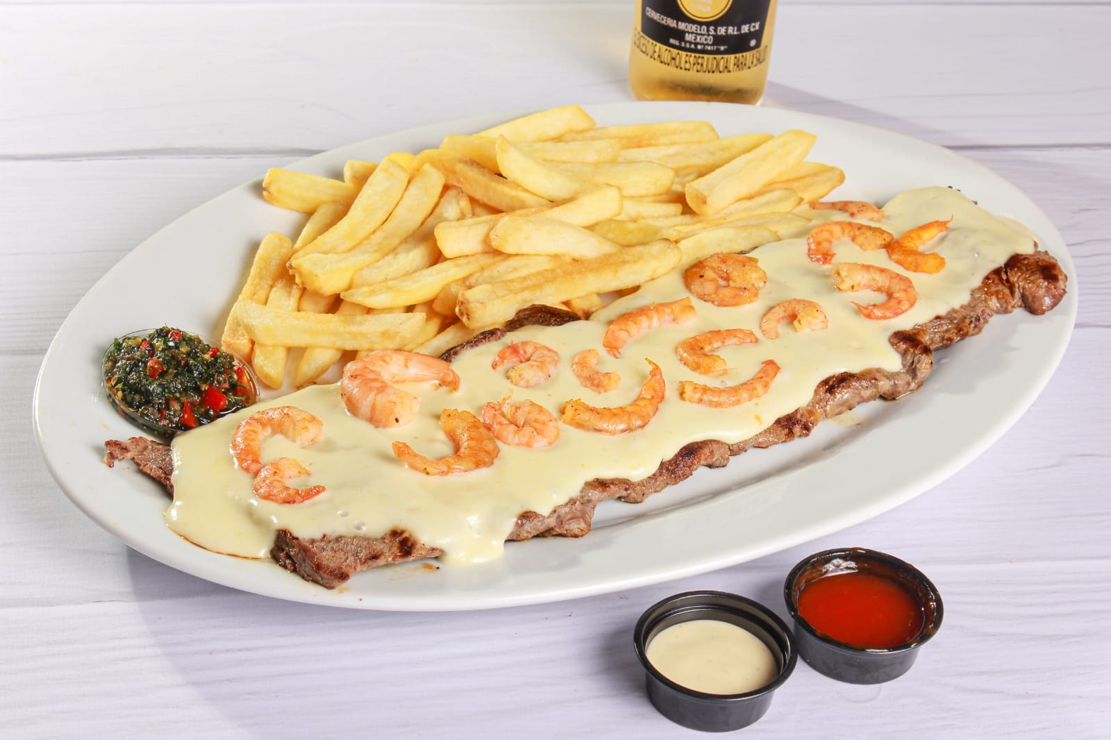Lomo fino gratinado con camarón con acompañamiento a elección, ensalada