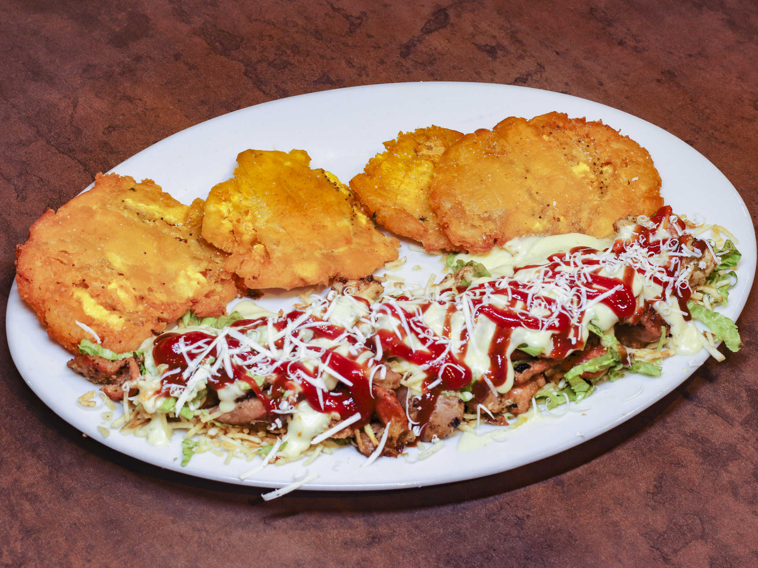 Patacones con proteina de pollo y lomo fino, papa chongo con salsas taratara y salsa de tomate, acompañado de queso.