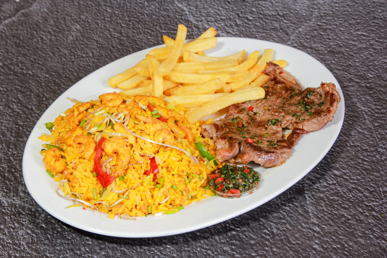Arroz con verduras especiales de la casa + Proteínas lomo fino + Papas a la francesa