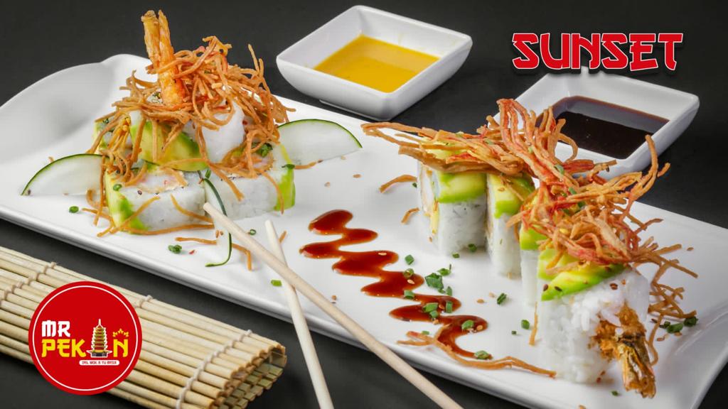 10 bocados rellenos de salmón fresco, aguacate, queso crema y cebollin. topping: ajonjoli + RELLENO DE PALMITO DE CANGREJO APANADO, AGUACATE Y QUESO CREMA SALSA DE MELOCOTON Y TERIYAKI