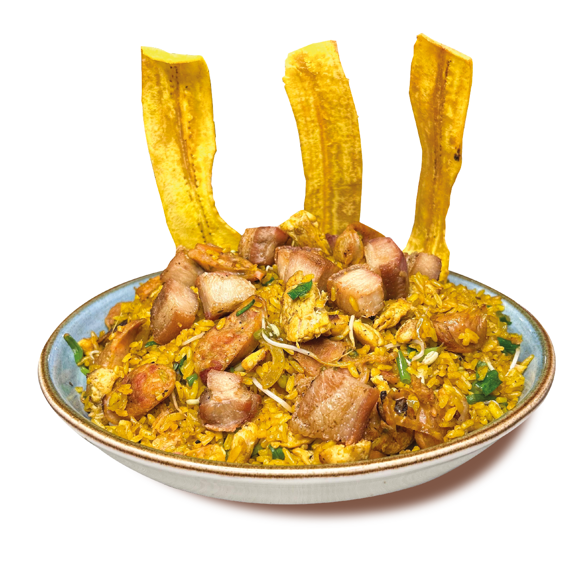 Arroz de pollo, chorizo especial, butifarra , cerdo al barril , y tostones de platano (Ideal para 1, maximo 2 porciones)