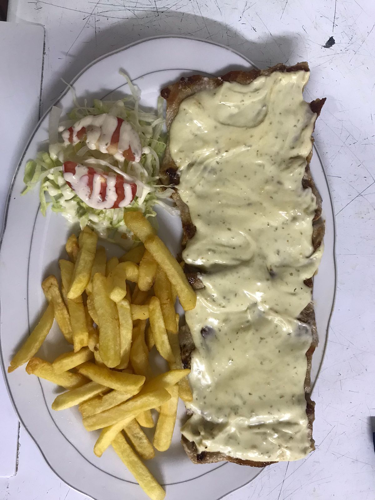 Lomito de cerdo gratinado acompañado de papas fritas y ensalada.