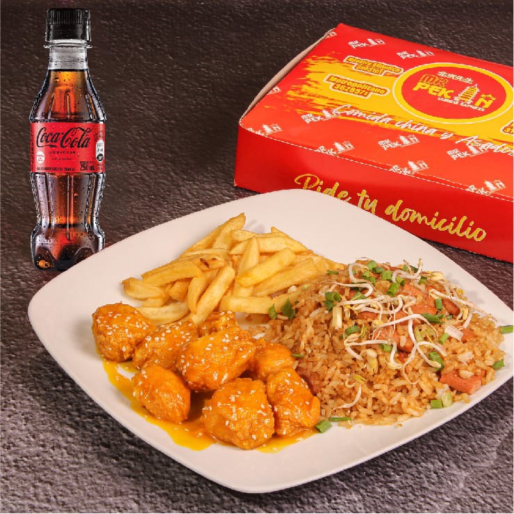 Pechuga en cubos con salsa agridulce + arroz de jamón porción + Papas a la francesa + Bebida 250ml (Producto Cocacola)