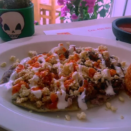 Huarache (tortilla mas gruesa y grande que las normales) con frijoles, queso y crema .