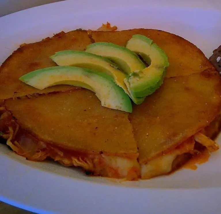 Pollo a la mexicana con queso entre 2 tortillas de maíz con aguacate.